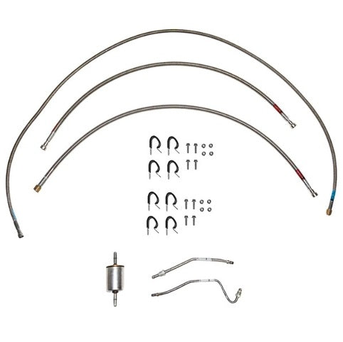 Our Quick-Fix Fuel Line Kits comes with everything needed to replace your leaky fuel lines. They are Pre-Cut to the exact length for your vehicle. Unlike the original fuel lines that use hard steel lines and rubber hose, our Quick-Fix Fuel Line Kits use a braided stainless steel fuel line that will connect to your fuel tank (or drop hoses) and run all the way up to the fuel rail.