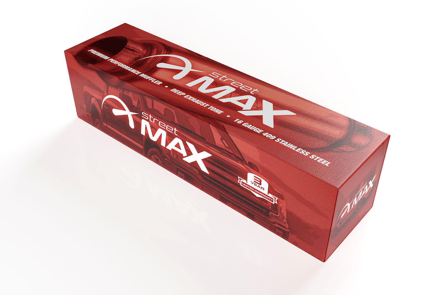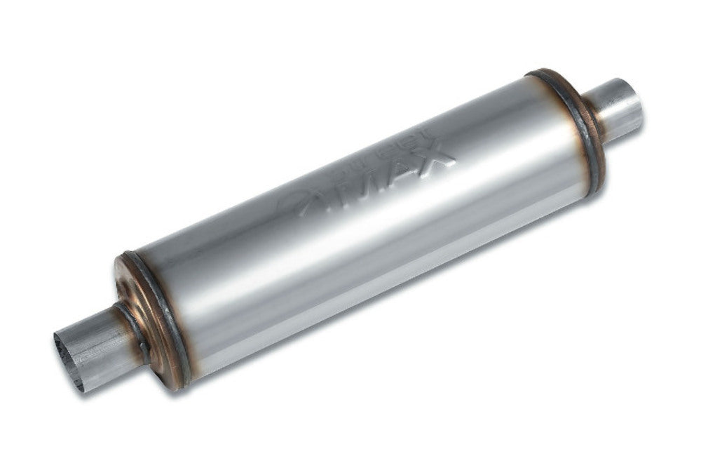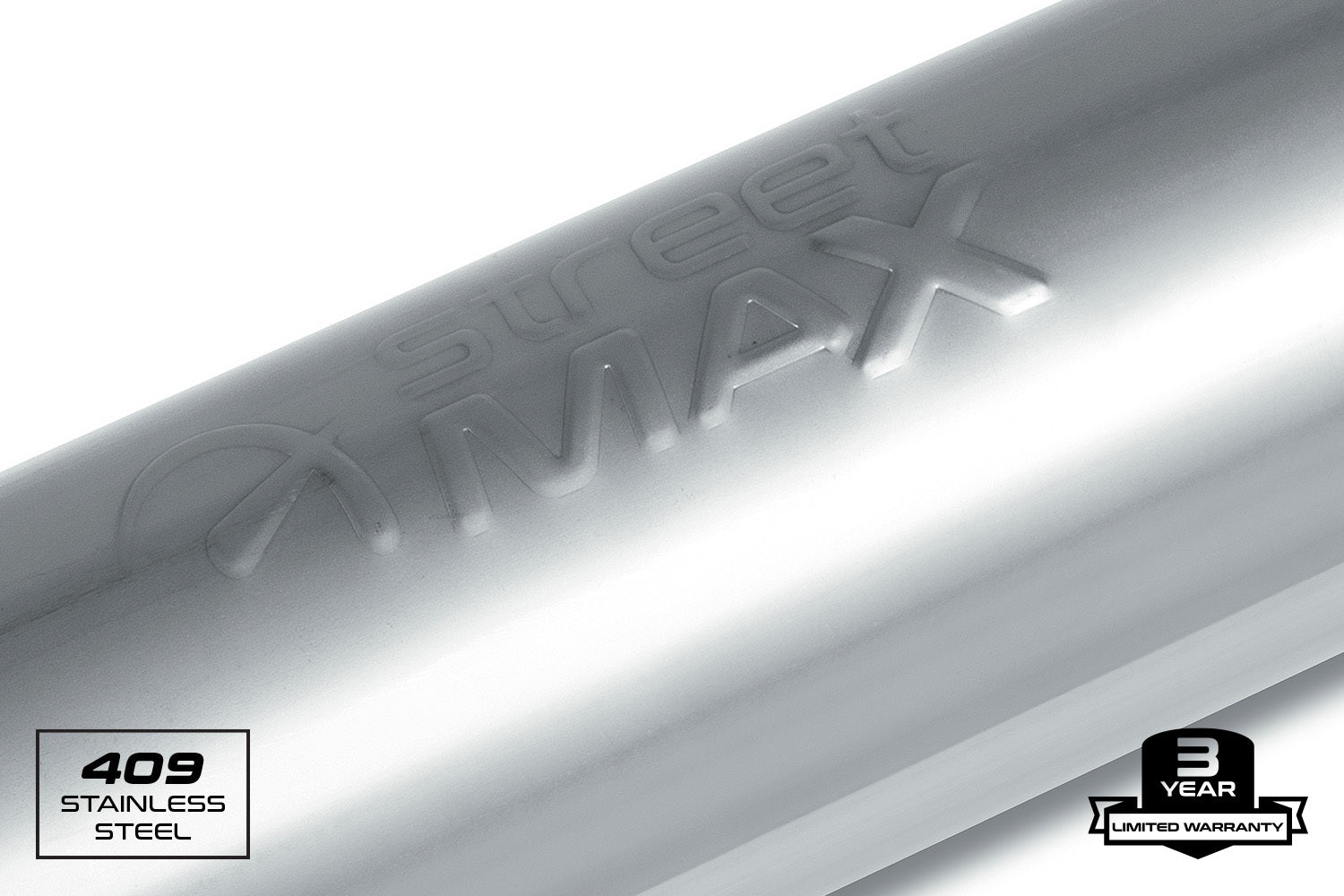Street Max, Stainless Straight-Through Performance Muffler, 6.0" x 18.0" Round Body, Moderate Tone, 16-Gauge 409-Grade Stainless Steel, Satin Finish, 2.0" Center In, 2.0" Center Out, Reversible, 3 Year Limited Warranty.