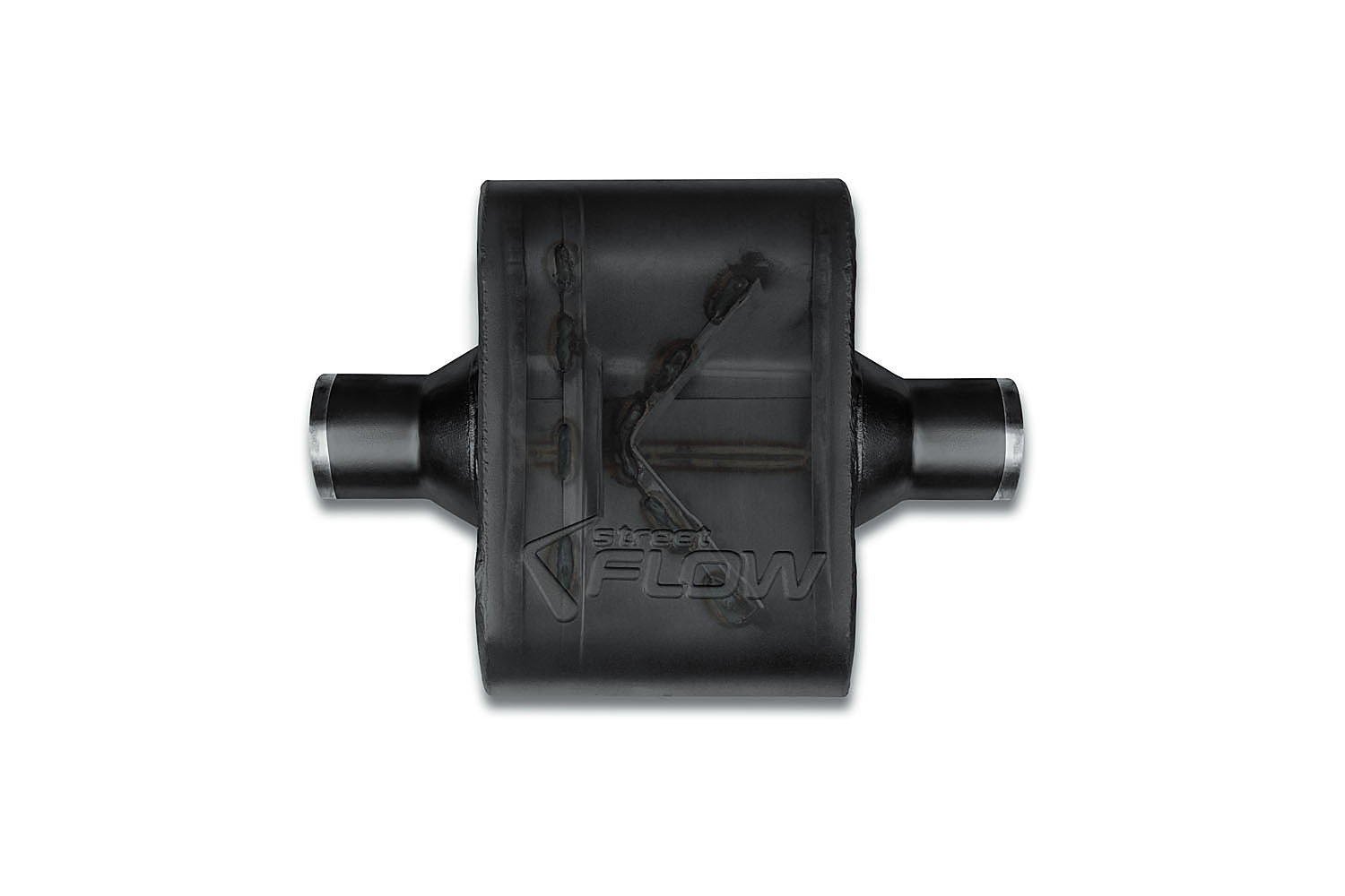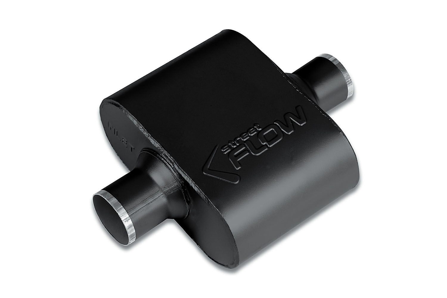 Street Flow Stainless, 1 Chamber Performance Muffler, Aggressive Tone, 16-Gauge 409-Grade Stainless Steel, Premium Powder Coat Finish, 2.25" Center In, 2.25" Center Out, 5 Year Limited Warranty.