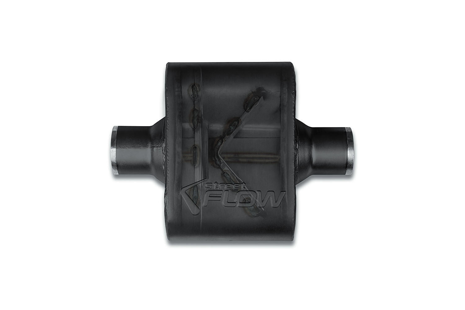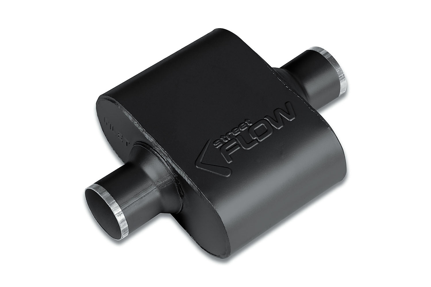 Street Flow Stainless, 1 Chamber Performance Muffler, Aggressive Tone, 16-Gauge 409-Grade Stainless Steel, Premium Powder Coat Finish, 2.5" Center In, 2.5" Center Out, 5 Year Limited Warranty.