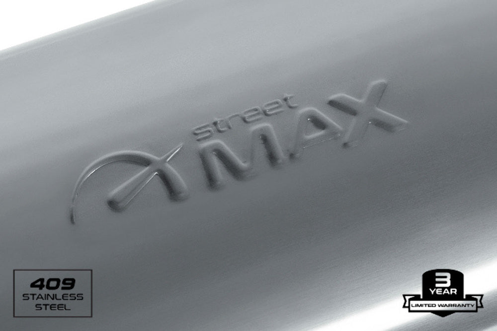 Street Max, Stainless Straight-Through Performance Muffler, 4.0" x 9.0" x 14.0" Oval Body, Aggressive to Moderate Tone, 16-Gauge 409-Grade Stainless Steel, Satin Finish, 3.0" Center In, 3.0" Center Out, Reversible, 3 Year Limited Warranty.