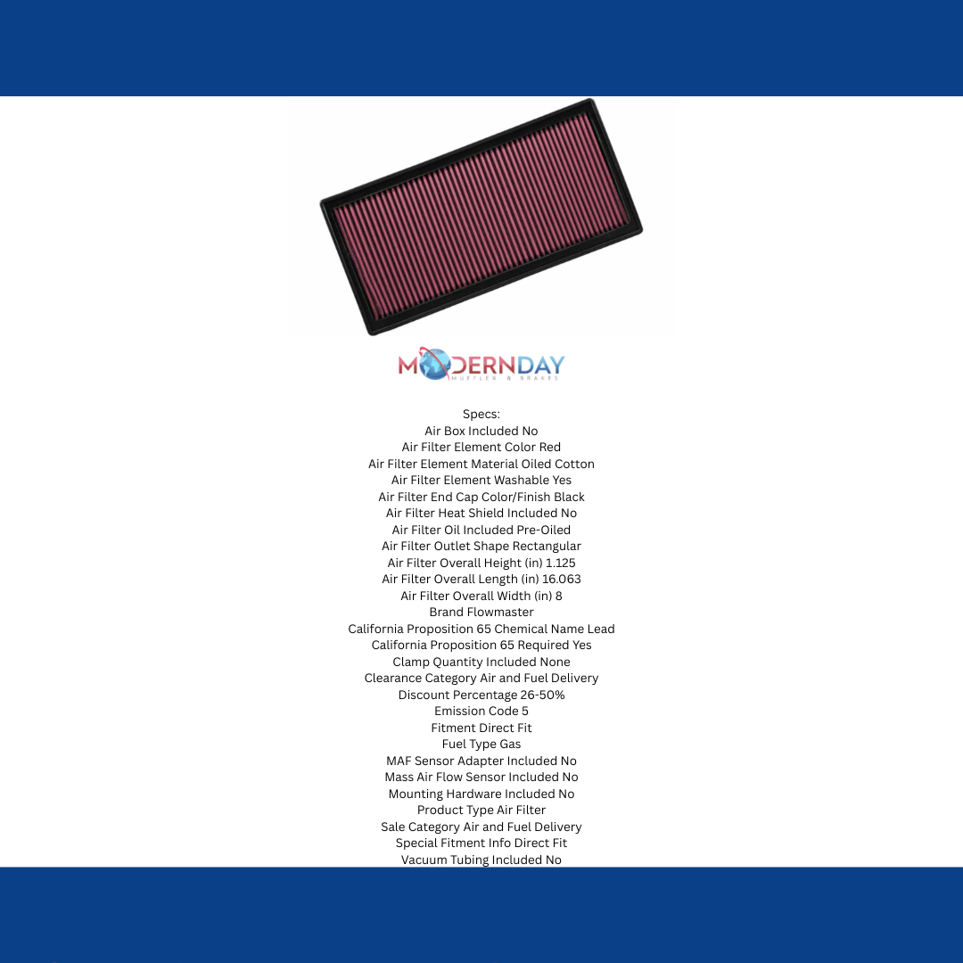 Fits 1998-2002 Chevrolet Camaro, Flowmaster Flat Panel Style Air Filter 615030