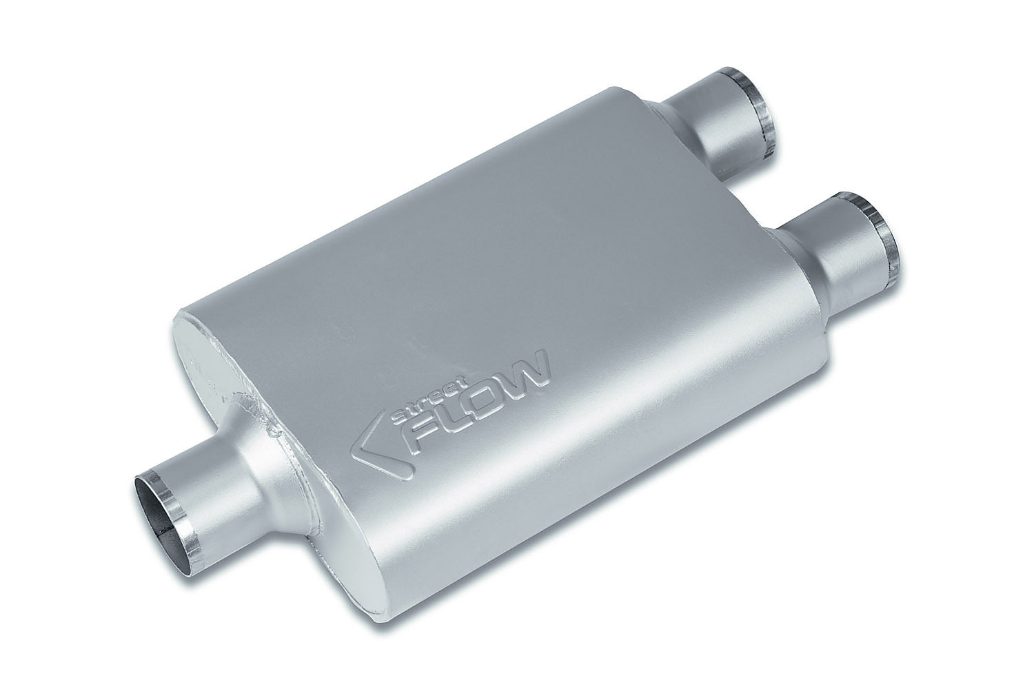 Street Flow, 2 Chamber Performance Muffler, Aggressive to Moderate Tone, 16-Gauge Aluminized Steel, Premium Powder Coat Finish, 2.5" Center In, 2.5" Dual Out, 3 Year Limited Warranty.