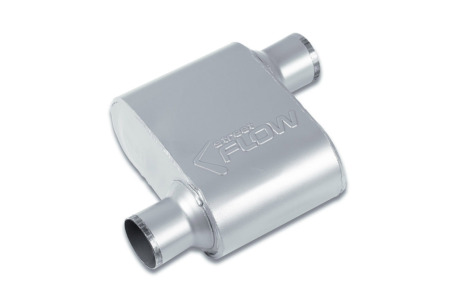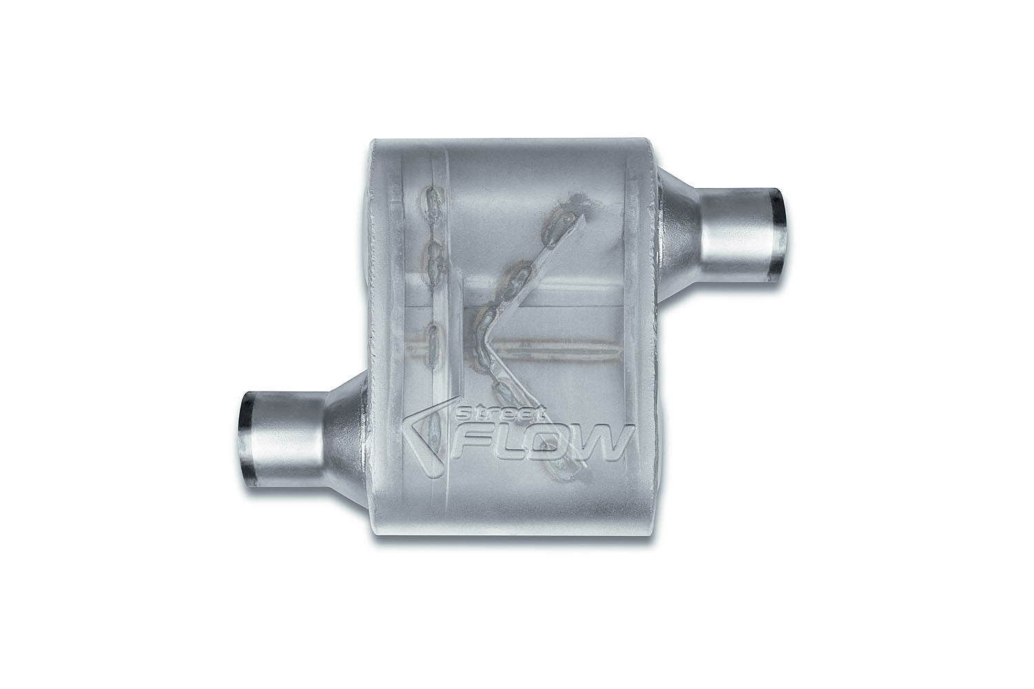 Street Flow, 1 Chamber Performance Muffler, Aggressive Tone, 16-Gauge Aluminized Steel, Premium Powder Coat Finish, 2.25" Offset In, 2.25" Offset Out, 3 Year Limited Warranty.