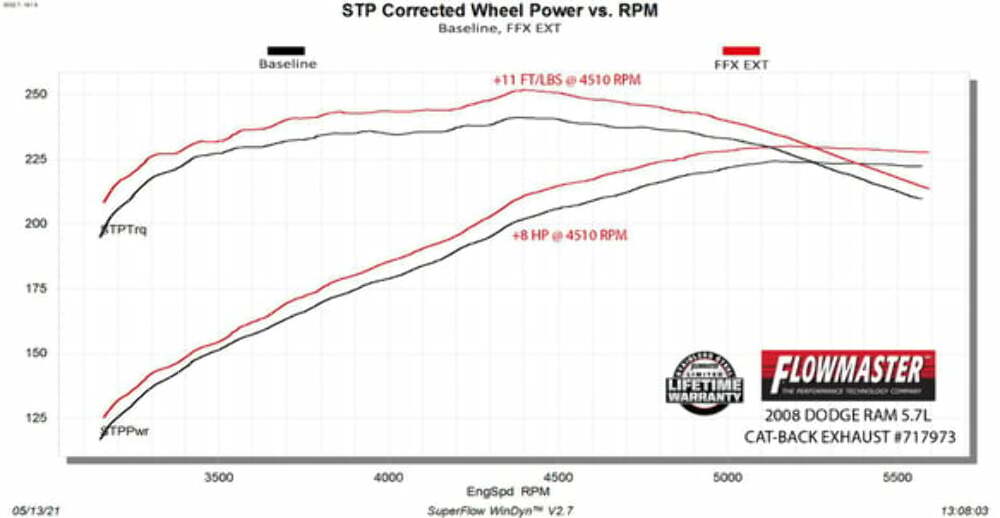 Flowmaster introduces our FlowFX Extreme stainless steel exhaust system for the 2006-2008 Dodge RAM 1500 trucks with the 5.7-liter engine. This system uses a FlowFX series muffler for an aggressive to moderate sound level and increased performance. 3.00-inch mandrel bent 409 stainless steel tubing allows for maximum exhaust flow and durability. The system has a turndown style, dump exit right after the muffler to eliminate the over-axle tailpipe. This elimination of the tailpipe helps improve ground clearance and departure angle when you are driving in more extreme off-road situations. On the dyno this system showed max gains of 8 hp and 11 lb-ft of torque at the rear wheels. All of the necessary hardware is included, and factory-mounting locations are used for an easy installation. Backed by Flowmaster's Lifetime Limited Warranty.