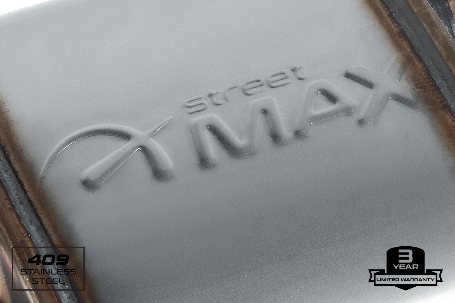 Street Max, Stainless Straight-Through Performance Muffler, 4.0" x 9.0" x 7.0" Oval Body, Aggressive Tone, 16-Gauge 409-Grade Stainless Steel, Satin Finish, 3.0" Center In, 2.5" Dual Out, Reversible, 3 Year Limited Warranty.