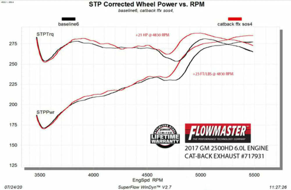 - Max increases of up to 21 hp and 23 lb-ft over the stock exhaust at the rear wheels