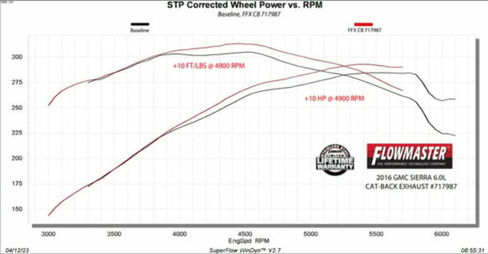 This Flowmaster FlowFX cat-back exhaust system for the 2011-2019 GM 2500HD/3500HD trucks with the 6.0-liter engine is manufactured using durable 409 stainless steel throughout and features 3.50 to 3.00-inch mandrel bent pipes for better exhaust gas flow. This system exits with dual 4.00-inch black stainless steel tips for added style and a custom look. Max gains of 10 hp and 10 lb-ft of torque at the rear wheels over stock. The system uses all the existing factory hanger locations and includes installation instructions and all necessary hardware for an easy installation that you can do at home. Fits extended cab or crew cab models with the 6.5 foot bed only. Backed by Flowmaster's Lifetime Limited Warranty.