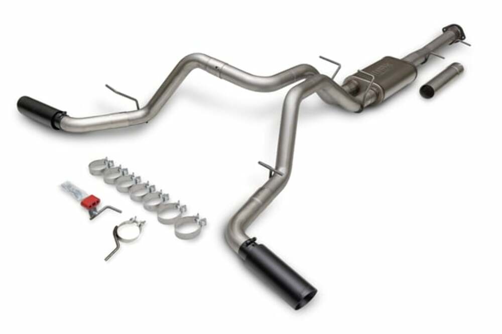 - 4.00-Inch black stainless steel tips add a custom look to the truck