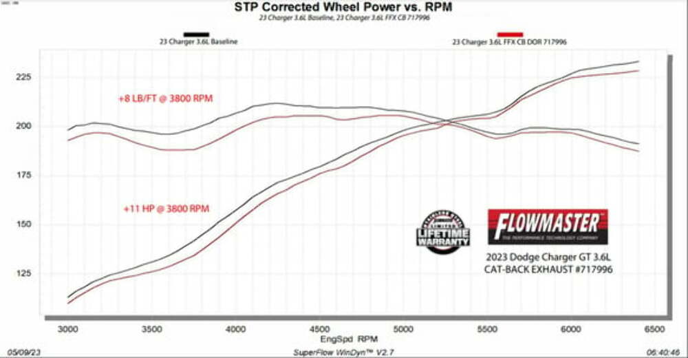 This Flowmaster Flow FX exhaust system for the 2018-2023 Dodge Charger GT / GT Plus and 2015-2023 Pursuit / Enforcer models with the 3.6-liter engine is manufactured using durable 409 stainless steel throughout and features 2.5-inch mandrel bent tubing for better exhaust gas flow. Dual Flow FX series mufflers are used for an aggressive to moderate exhaust note and increased performance. This system exits with dual 4.0-inch black ceramic coated stainless steel tips for added style and a custom look. Max gains of 11 hp and 8 lb.ft. of torque at the rear wheels over stock. The system uses all the existing factory hanger locations and includes installation instructions and all necessary hardware for an easy installation that you can do at home. Backed by Flowmaster's Lifetime Limited Warranty.