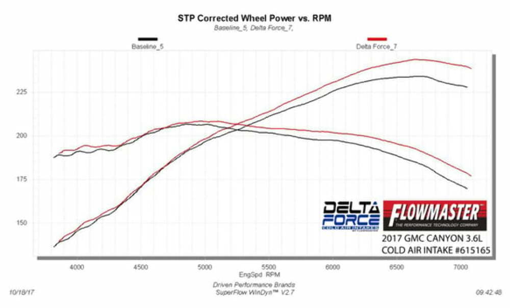 Take the performance of your vehicle to the next level with the addition of Flowmaster's new Delta Force Performance Air Intake system for 2017-2018 Chevrolet Colorado and GMC Canyon trucks with 3.6L engine. The Delta Force system contains an ultra-trick looking, custom molded black Cross-Linked Polyethylene (XLPE) high-flow intake tube, black anodized aluminum fittings (when applicable), high quality reinforced silicone couplers and all stainless steel hardware. Other features include a large diameter high-flow conical shaped 8 layer cotton gauze air filter, which traps more dirt than typical 6 layer designs, a custom-fit black powder-coated air dam with attachment brackets to securely mount the system in place along with soft bumpers to eliminate any metal to metal contact under the hood. The Delta Force Air Filters are serviceable with our new Delta Force cleaning kits which will help outlast your vehicle. For maximum performance and that iconic Flowmaster exhaust tone, we highly recommend pairing your new Delta Force Performance Air Intake with a Flowmaster exhaust system.