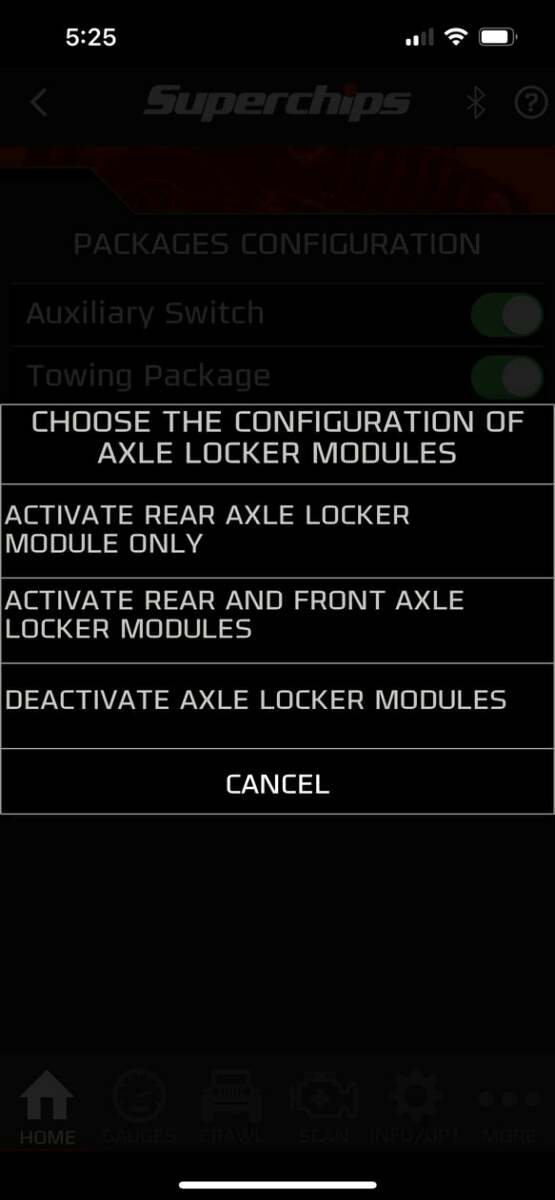 - Axle Lock Rear OR Front and Rear w/ T-case in 4-Hi & 4-Low (CRAWL Screen, Rubicon Only)