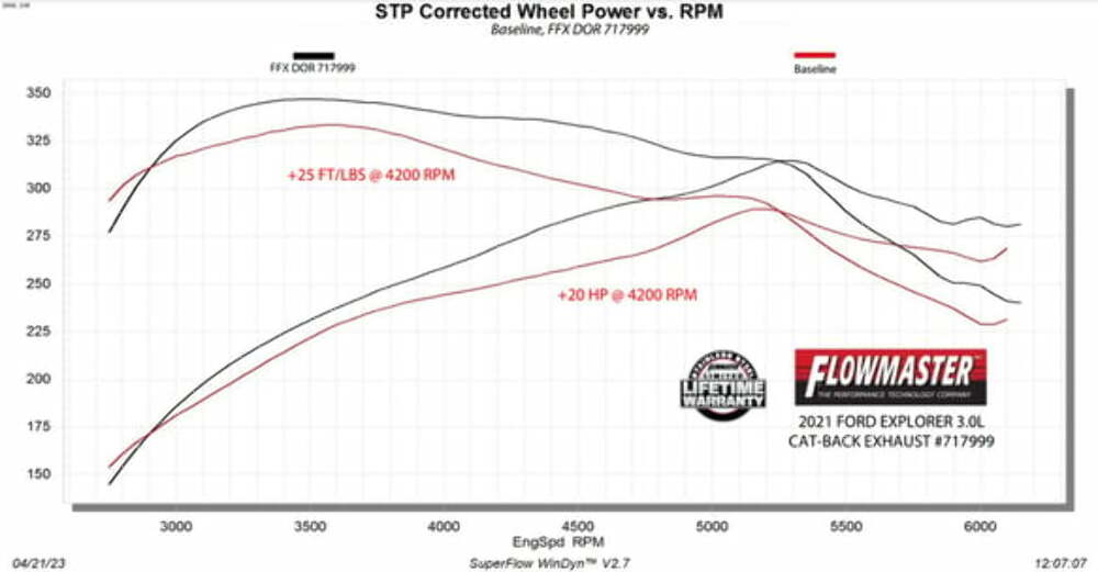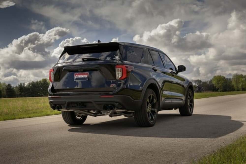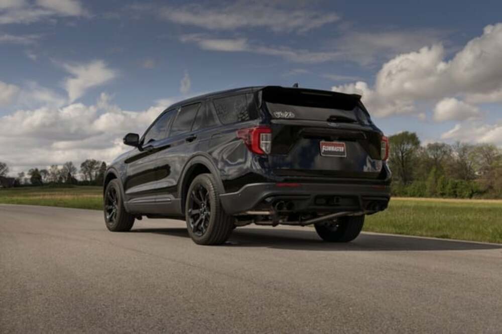 This Flowmaster Flow FX Exhaust system for the 2020-2023 Ford Explorer ST and Lincoln Aviator with the 3.0-liter twin turbo Ecoboost engine is manufactured using durable 409 stainless steel throughout and features 3.00-inch mandrel bent tubing for better exhaust gas flow. A Flow FX series muffler is used with a built in X-pipe style merge for an aggressive to moderate European exhaust note and increased performance. This system exits with dual 3.50-inch black stainless steel tips for added style and a custom look. Max gains of 20 hp and 25 lb-ft of torque at the rear wheels over stock. Unique Helmholtz style resonators are used for reduced interior resonance while driving. The system uses all the existing factory hanger locations and includes installation instructions and all necessary hardware for an easy installation that you can do at home. Backed by Flowmaster's Lifetime Limited Warranty.