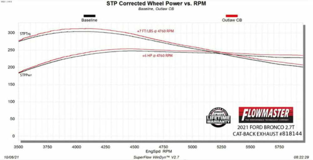 Flowmaster introduces our Outlaw exhaust system for the 2021-2023 Ford Bronco 2 door with the 2.3 or 2.7-liter engine. This system uses an Outlaw style muffler for an aggressive exhaust tone and increased performance. Maximum dyno gains of 6 hp and 7 lb-ft were measured at the rear wheels. 3.00-inch mandrel bent 409 stainless steel tubing is used to maximize exhaust flow and durability. This step up from the factory pipe size will help maximize gains from additional engine upgrades. Dual 4.00-inch black chrome tips are used to add a custom look to this iconic vehicle. All of the necessary hardware is included and factory mounting locations are used for an easy installation. Backed by Flowmaster's Lifetime Limited Warranty.