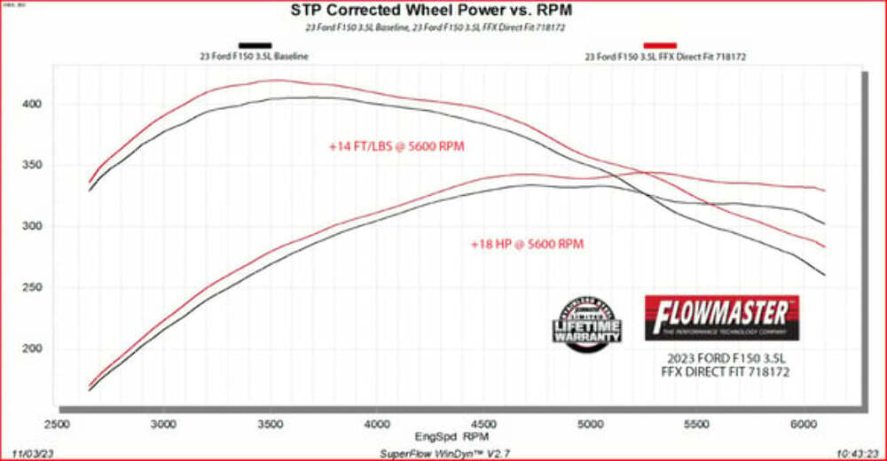 This Flowmaster FlowFX Direct-Fit Muffler system for the 2021-2024 Ford F-150 trucks with the 2.7, 3.5 or 5.0-liter engines is manufactured using durable 409 stainless steel throughout and features 3.00-inch mandrel bent pipes for optimum exhaust gas flow. A Flowmaster FlowFX Series muffler is used for an aggressive to moderate sound level and maximum performance. Performance increases on the dyno revealed an increase of 18 hp and 14 ft/lbs. at the rear wheels. This system connects directly to the factory dual tail pipes and uses all the existing factory hangers. Includes installation instructions and all necessary hardware for an easy installation that you can do at home. Backed by Flowmaster's Lifetime Limited Warranty.