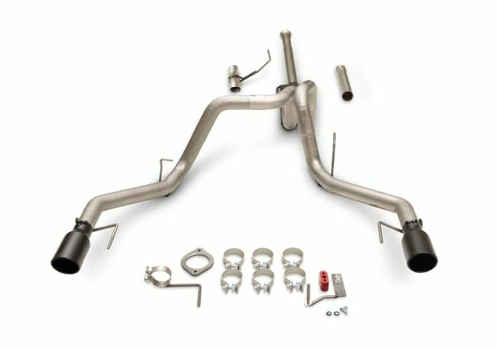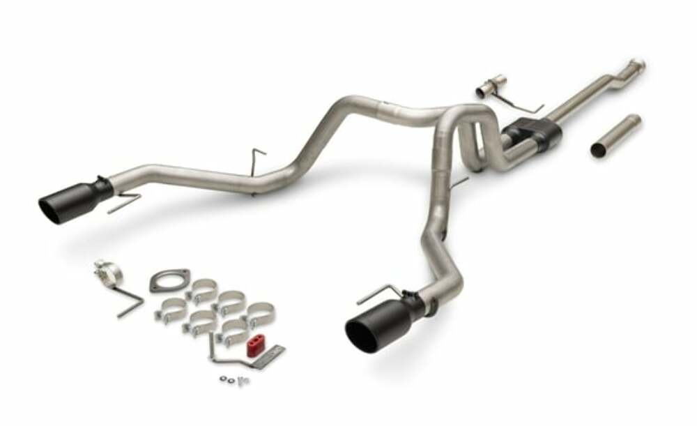 Flowmaster introduces our Outlaw cat-back exhaust system for the 2021-2024 Ford F-150 with the 2.7, 3.5, or 5.0-liter engine and factory dual exit exhaust. The exhaust kit fits PowerBoost and non-hybrid models. This system uses the Super 10 series muffler for an aggressive exhaust tone and increased performance. Maximum dyno gains of 18 hp and 15 lb-ft were measured at the rear wheels. 3.00-inch mandrel bent 409 stainless steel tubing is used to maximize exhaust flow and durability. Dual 4.50-inch black ceramic coated stainless steel tips are used to add a custom look to the truck. All the necessary hardware is included and factory mounting locations are used for an easy installation. Backed by Flowmaster's Lifetime Limited Warranty.