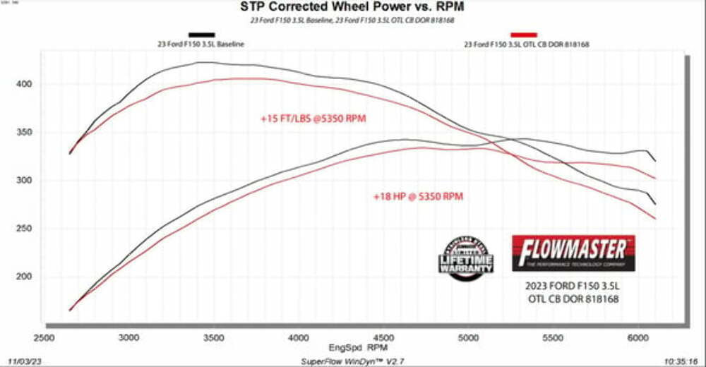 - Max increases of up to 18 hp and 15 lb-ft over the stock exhaust at the rear wheels