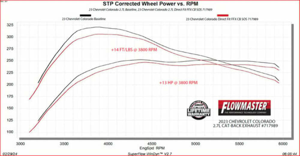This Flowmaster FlowFX cat-back exhaust system is designed to fit the 2023-2024 GM Colorado/Canyon pickup with the 2.7-liter turbo engine. This system is manufactured using durable 409 stainless steel tubing and features single 3.00-inch mandrel bent pipes for enhanced exhaust gas flow. A FlowFX "straight-through" muffler is used for a moderate to mild sound level and maximum performance. Dyno testing revealed maximum increases of 13 hp and 14 lb-ft at the rear wheels. This system exits out the side of the truck with a 4.50-inch black ceramic coated tip for added style. It uses all the existing factory hanger locations and includes installation instructions and all necessary hardware for an easy installation that you can do at home. Backed by Flowmaster's Lifetime Limited Warranty.