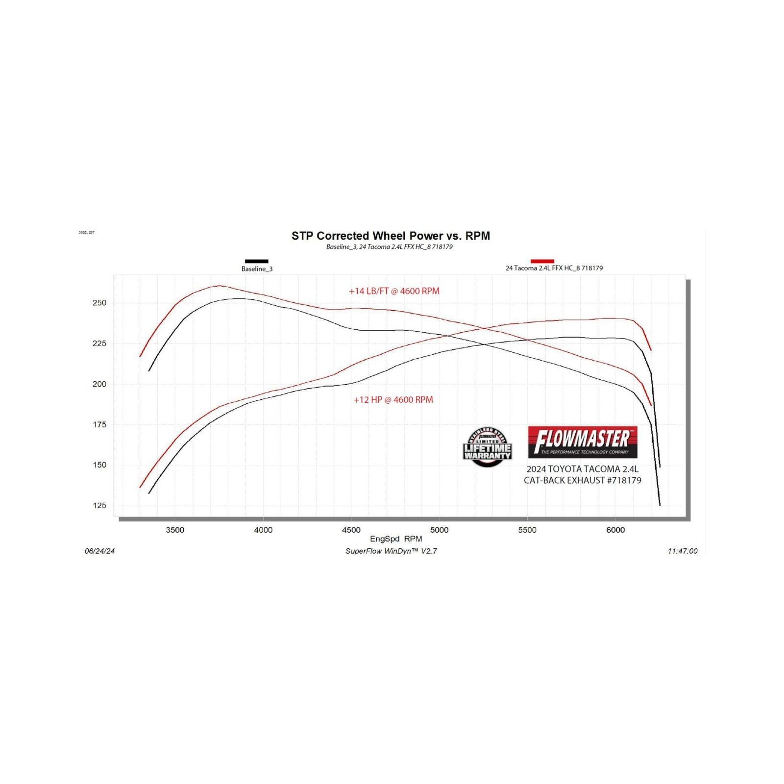 Flowmaster's® Flow FX Cat-back high clearance exhaust system is for the 2024-2026 Toyota Tacoma with the 2.4-liter engine. This performance exhaust system fits both 2/4 Wheel drive models and is manufactured from 409 stainless steel for years of trouble-free service and performance. Features include a 3.00-inch inlet pipe leading into a 409 stainless steel Flow FX series "straight-through" muffler for great sound and maximum performance. The dual 2.5-inch mandrel-bent high clearance tailpipes exit out the driver side and offer better departure angles when off-roading. Max dyno gains of 12 hp and 14 lb-ft at the rear wheels. The system uses all the factory hanger locations and connections for an easy installation that you can do at home. Includes installation instructions and all necessary hardware. Backed by Flowmaster's Lifetime Limited Warranty.