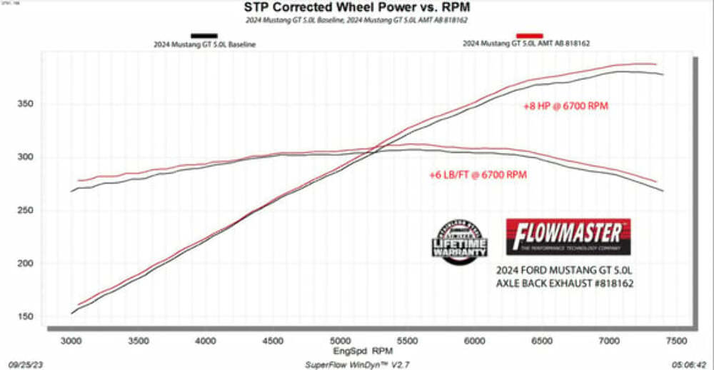Flowmaster introduces our American Thunder axle-back exhaust system for the 2024 Ford Mustang GT with the 5.0-liter engine or the EcoBoost 2.3L engine and the standard factory non-valved exhaust system. This system uses the Super 44 series mufflers for an aggressive exhaust tone and increased performance. Maximum dyno gains of up to 8 hp and 6 lb-ft were measured at the rear wheels. 3.00-inch mandrel bent 409 stainless steel tubing is used to maximize exhaust flow and durability. Dual 4.00-inch polished stainless steel tips are used to add a custom look to this iconic vehicle. All the necessary hardware is included and factory mounting locations are used for an easy installation. Fits both coupes and convertibles. Backed by Flowmaster's Lifetime Limited Warranty.