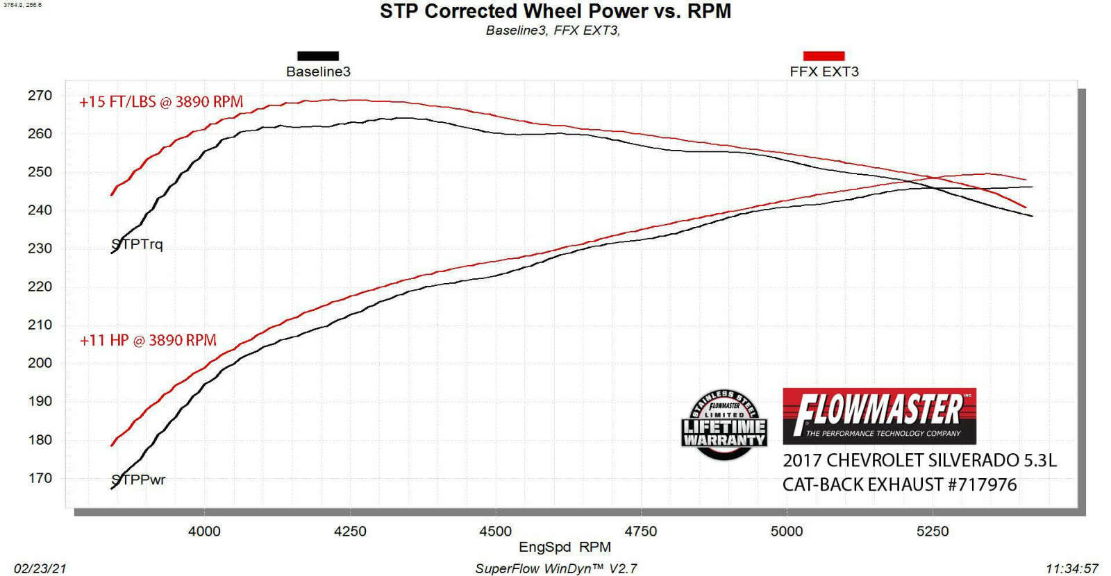 Flowmaster introduces our FlowFX Extreme stainless steel exhaust system for the 2014-2019 Chevrolet/GMC Silverado/Sierra 1500 with the 4.3 or 5.3-liter engine. This system uses a FlowFX series muffler for an aggressive to moderate sound level and increased performance. 3.0-inch mandrel bent 409 stainless steel tubing allows for maximum exhaust flow and durability. The system has a turndown style, dump exit right after the muffler to eliminate the over-axle tailpipe. This elimination of the tailpipe helps improve ground clearance and departure angle when you are driving in more extreme off-road situations. This system produced max dyno gains of 11 hp and 15 lb-ft at the rear wheels. All of the necessary hardware is included, and factory-mounting locations are used for an easy installation. Backed by Flowmaster's Lifetime Limited Warranty.