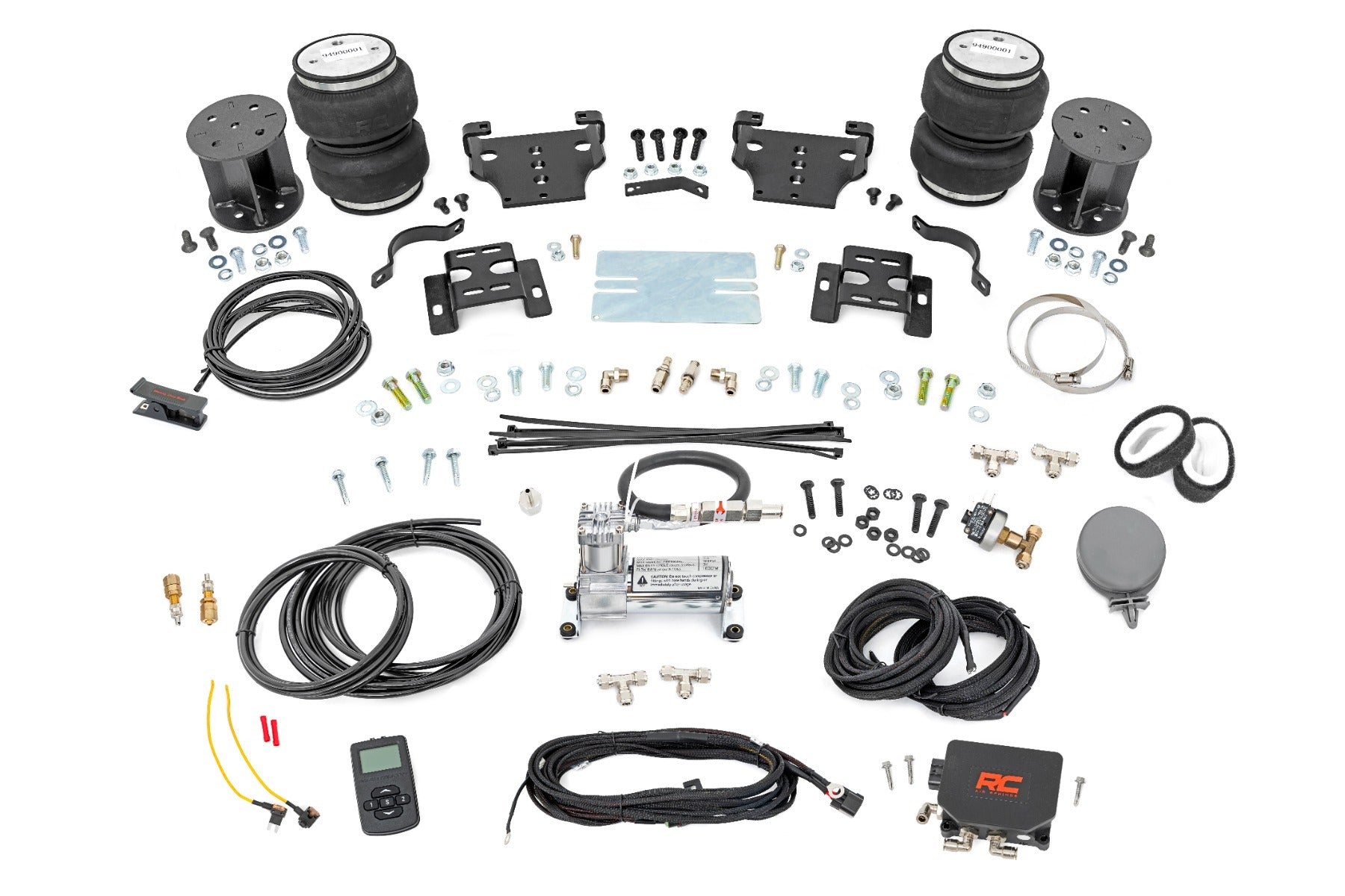 Ideal Leveling. Is your truck your workhorse? The main attraction to the pick-up line is the accessibility to haul and tow as desired. However, due to the amount of weight in the bed, or the condition of the vehicle's rear leaf springs, this can cause the vehicle to be un-level when under load. Here at Rough Country, we created an innovative new product to ensure that these are troubles of the past. Introducing, Rough Country's Rear Air Spring Kit. Heavy-duty Construction. Rough Country's Rear Air Spring Kit features two RC branded high-quality double convoluted airbags complemented with DOT-approved airlines. Whether you plan on towing or hauling in the not-so-distant future Rough Country's Air Spring kit is the must-have accessory to ensure that your trailer is level reducing the weight off of the tongue of your trailer. Each kit offers 1/4" push connector fittings and all of the bracketry needed to ensure installation is lightning fast and secure! Rough Country's Air Spring kit provides up to 5,000 lbs. of load support to ensure that you experience less sway and bottoming out when braking and steering!
