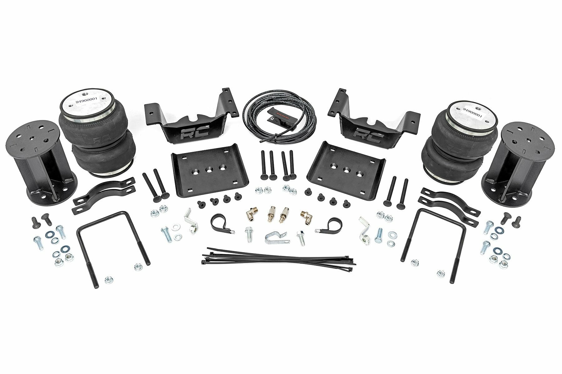 Ideal Leveling. Is your truck your workhorse? The main attraction to the pick-up line is the accessibility to haul and tow as desired. However, due to the amount of weight in the bed, or the condition of the vehicle's rear leaf springs, this can cause the vehicle to be un-level when under load. Here at Rough Country, we created an innovative new product to ensure that these are troubles of the past. Introducing, Rough Country's Rear Air Spring Kit.Heavy-duty Construction. Rough Country's Rear Air Spring Kit features two RC branded high-quality double convoluted airbags complemented with DOT-approved airlines. Whether you plan on towing or hauling in the not-so-distant future Rough Country's Air Spring kit is the must-have accessory to ensure that your trailer is level reducing the weight off of the tongue of your trailer. Each kit offers 1/4" push connector fittings and all of the bracketry needed to ensure installation is lightning fast and secure! Rough Country's Air Spring kit provides up to 5,000 lbs of load support to ensure that you experience less sway and bottoming out when braking and steering!Installation. With an estimated timeframe of 1-2 hours this full kit can be installed at home using standard tools and can be completed efficiently and quickly!Limited Lifetime Replacement Warranty. Rough Country's Rear Air Spring Kit is backed with a limited lifetime replacement warranty towards manufacturer defects. As such, the product is protected from structural and workmanship damage after the date of purchase. With our industry-leading warranty give yourself peace of mind when using Rough Country's Suspension products!