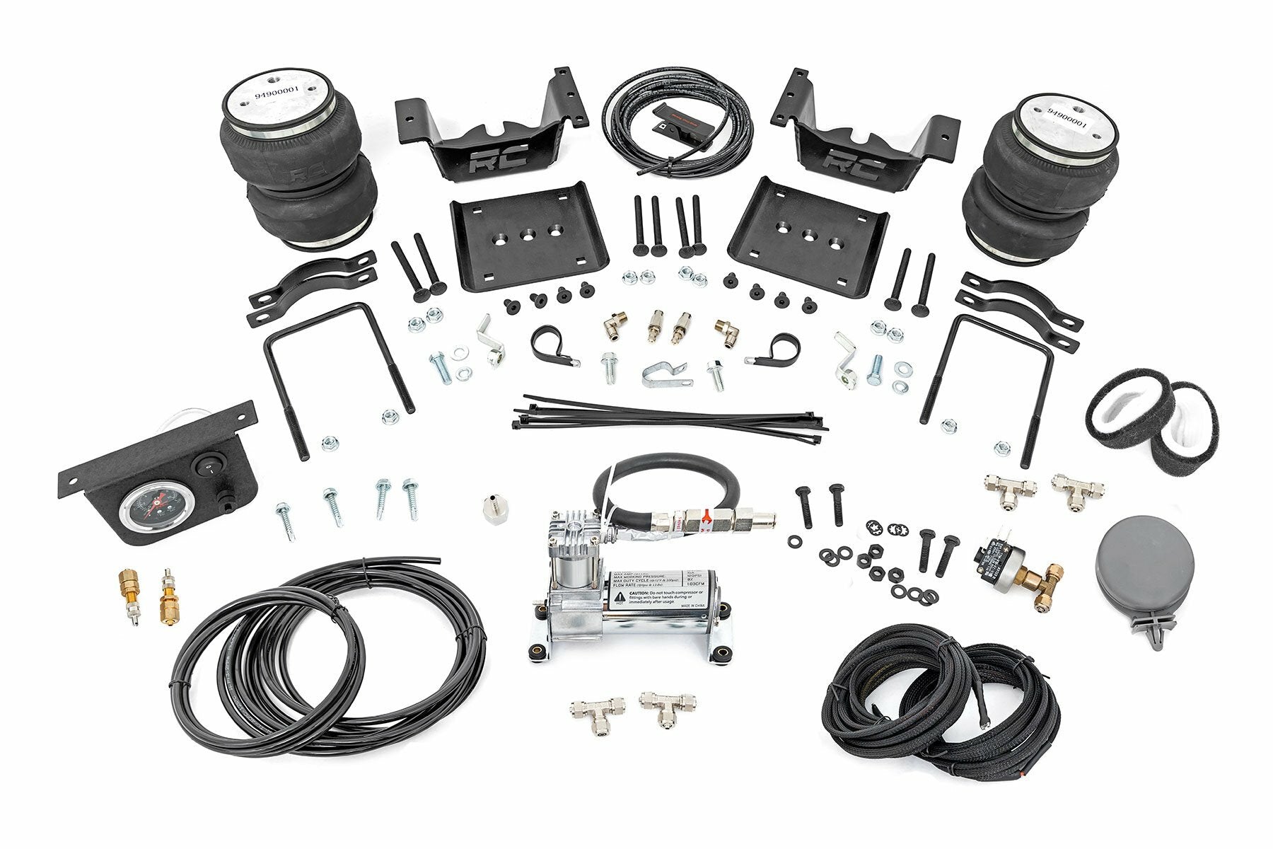 Ideal Leveling. Is your truck your workhorse? The main attraction to the pick-up line is the accessibility to haul and tow as desired. However, due to the amount of weight in the bed, or the condition of the vehicle's rear leaf springs, this can cause the vehicle to be un-level when under load. Here at Rough Country, we created an innovative new product to ensure that these are troubles of the past. Introducing, Rough Country's Rear Air Spring Kit.Heavy-duty Construction. Rough Country's Rear Air Spring Kit features two RC branded high-quality double convoluted airbags complemented with DOT-approved airlines. Whether you plan on towing or hauling in the not-so-distant future Rough Country's Air Spring kit is the must-have accessory to ensure that your trailer is level reducing the weight off of the tongue of your trailer. Each kit offers 1/4" push connector fittings and all of the bracketry needed to ensure installation is lightning fast and secure! Rough Country's Air Spring kit provides up to 5,000 lbs of load support to ensure that you experience less sway and bottoming out when braking and steering!Installation. With an estimated timeframe of 1-2 hours this full kit can be installed at home using standard tools and can be completed efficiently and quickly!Limited Lifetime Replacement Warranty. Rough Country's Rear Air Spring Kit is backed with a limited lifetime replacement warranty towards manufacturer defects. As such, the product is protected from structural and workmanship damage after the date of purchase. With our industry-leading warranty give yourself peace of mind when using Rough Country's Suspension products!