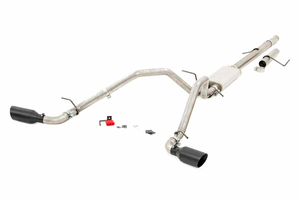 Give your truck an aggressive, throaty growl and killer good looks with Rough Country's Dual Cat-Back Exhaust System for Chevy / GMC Pickups . These durable exhaust systems are fine tuned to improve air flow and deliver and the perfect aftermarket exhaust note that will put a smile on your face every time you hit the gas. Rough Country Dual Cat-Back Exhaust Systemsfeature a set of high-temp resistant, dual-wall 304 black stainless tips with RC logo for an improved, aggressive look. Upgrading your exhaust note has never been easier! Each kit conveniently installs onto the factory hangers and features stainless clamps for easy assembly with no welding required! Transform your truck today and let your engine ROAR with the best exhaust kit money can buy!