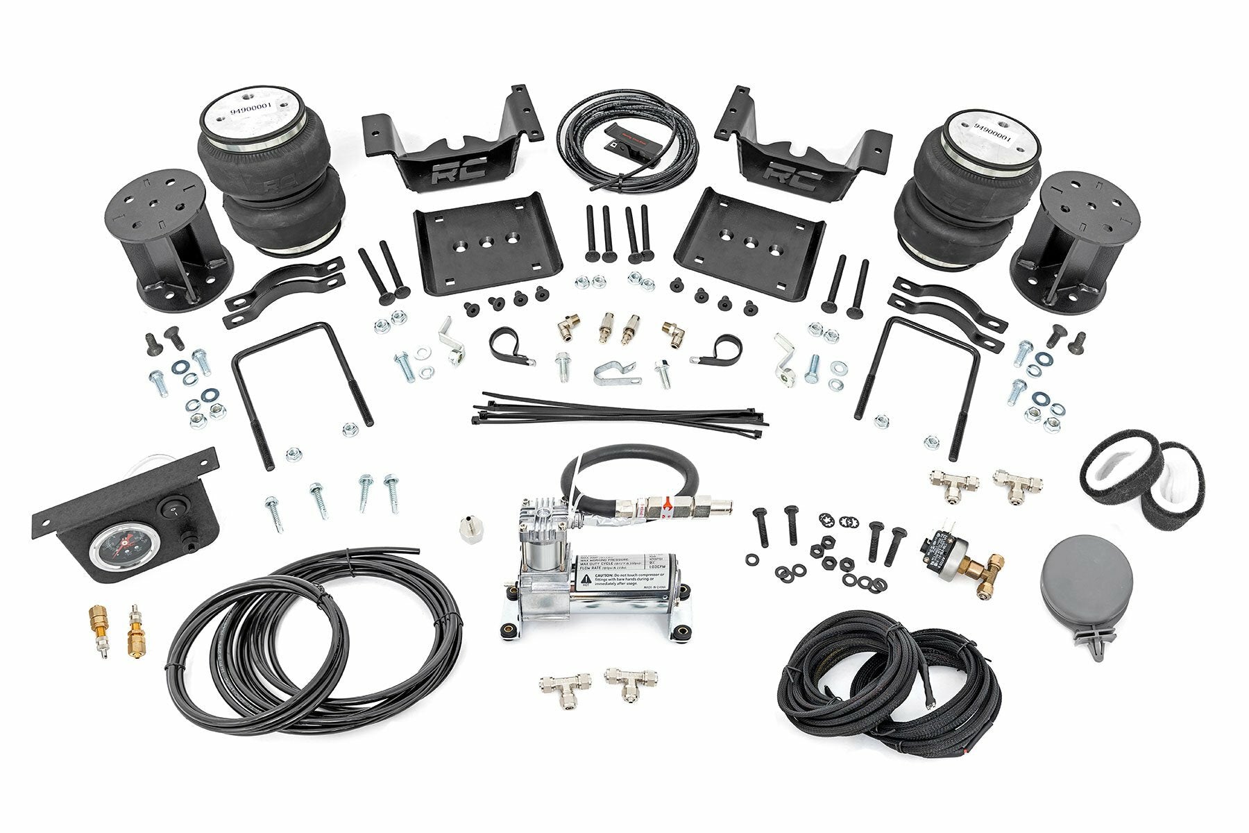 Ideal Leveling. Is your truck your workhorse? The main attraction to the pick-up line is the accessibility to haul and tow as desired. However, due to the amount of weight in the bed, or the condition of the vehicle's rear leaf springs, this can cause the vehicle to be un-level when under load. Here at Rough Country, we created an innovative new product to ensure that these are troubles of the past. Introducing, Rough Country's Rear Air Spring Kit.Heavy-duty Construction. Rough Country's Rear Air Spring Kit features two RC branded high-quality double convoluted airbags complemented with DOT-approved airlines. Whether you plan on towing or hauling in the not-so-distant future Rough Country's Air Spring kit is the must-have accessory to ensure that your trailer is level reducing the weight off of the tongue of your trailer. Each kit offers 1/4" push connector fittings and all of the bracketry needed to ensure installation is lightning fast and secure! Rough Country's Air Spring kit provides up to 5,000 lbs of load support to ensure that you experience less sway and bottoming out when braking and steering!Installation. With an estimated timeframe of 1-2 hours this full kit can be installed at home using standard tools and can be completed efficiently and quickly!Limited Lifetime Replacement Warranty. Rough Country's Rear Air Spring Kit is backed with a limited lifetime replacement warranty towards manufacturer defects. As such, the product is protected from structural and workmanship damage after the date of purchase. With our industry-leading warranty give yourself peace of mind when using Rough Country's Suspension products!