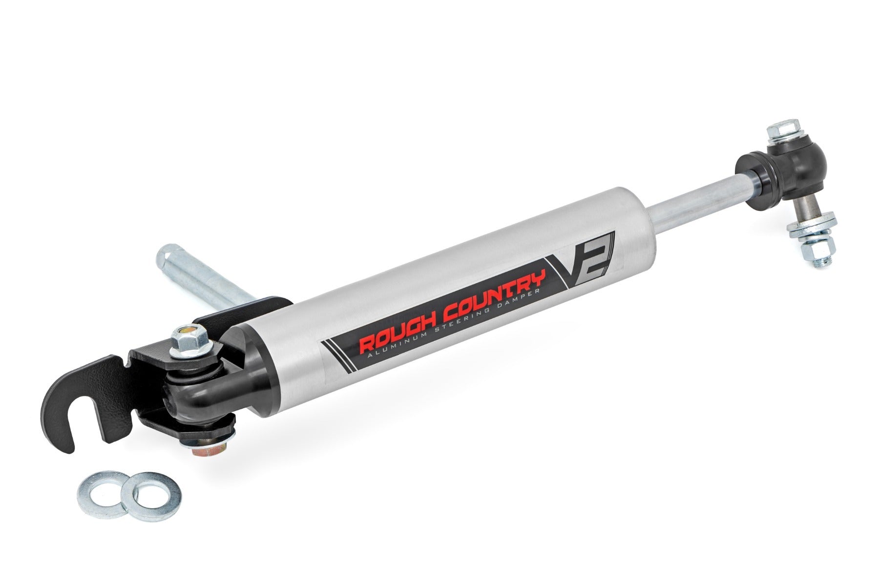 Superior Design and Comfort. Give yourself peace of mind when upgrading to a larger wheel and tire set up with Rough Country's V2 stabilizers! Steering stabilizers are designed to restrain "bump steer" and front-end vibration, giving added life to tires, ball joints, and other steering components. Rough Country's V2 stabilizers improve the overall driving experience providing precise dampening raising the vehicle's overall comfort and functionality. Durable Construction. Rough Country's V2 stabilizers boast a T6061 brushed aluminum body with black anodized accents giving it a striking visual appearance that also dissipates heat faster than other materials. The internal 46mm high-flow piston offers countless years of durability. Rough Country's V2 stabilizers are the pinnacle of a true performance upgrade. Installation. Rough Country's V2 stabilizers can be installed in no time! This full kit can be installed at home using standard tools and can be completed efficiently and quickly! 3-Year Warranty. Rough Country's V2 stabilizers are backed with Rough Country's 3-year replacement warranty towards manufacturer defects. As such, the product is protected from structural and workmanship damage after the date of purchase. With our industry-leading warranty give yourself peace of mind when using Rough Country's Suspension products!