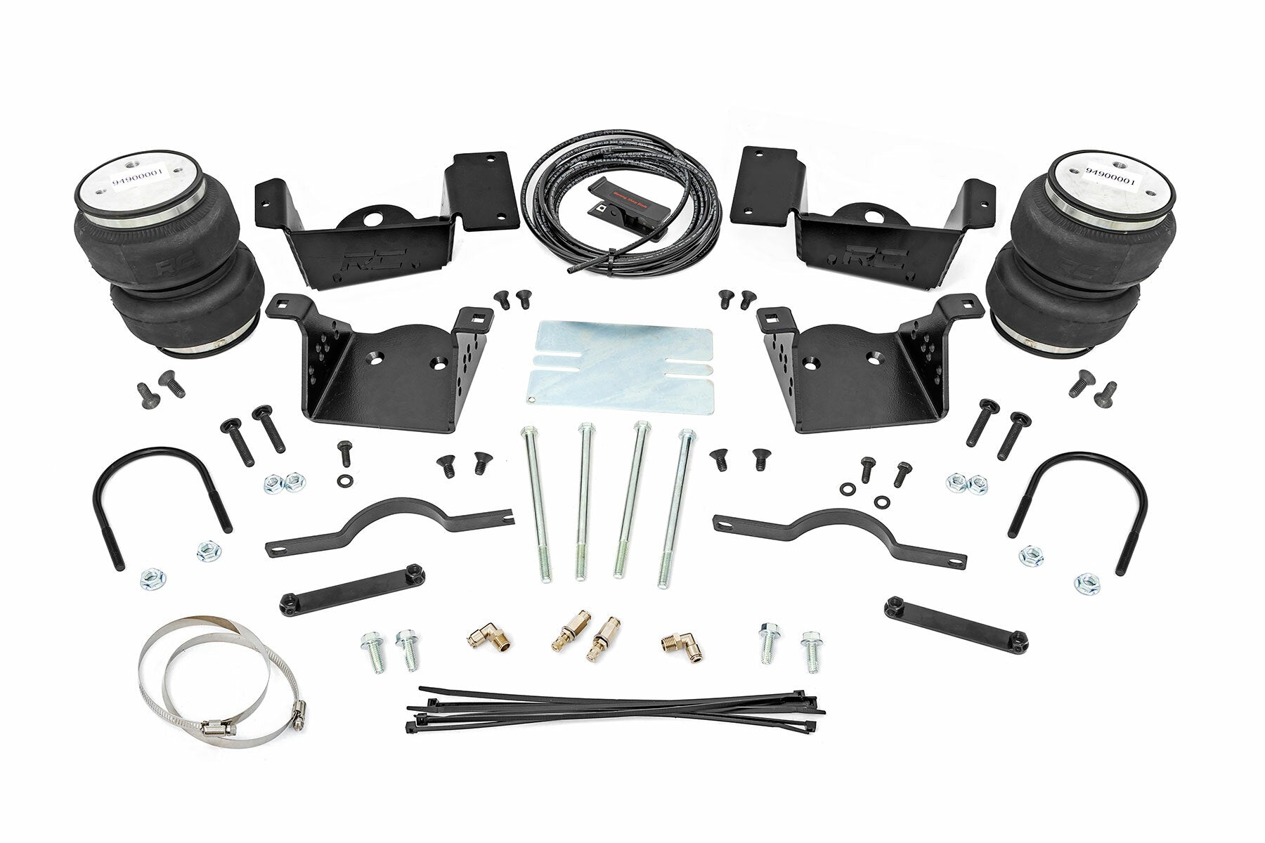 Is your truck your workhorse? The main attraction to the pick-up line is the accessibility to haul and tow as desired. However, due to the amount of weight in the bed, or the condition of the vehicle's rear leaf springs, this can cause the vehicle to be un-level when under load. Here at Rough Country, we created an innovative new product to ensure that these are troubles of the past. Introducing, Rough Country's Rear Air Spring Kit. Rough Country's Rear Air Spring Kit features two RC branded high-quality double convoluted airbags complemented with DOT-approved airlines. Whether you plan on towing or hauling in the not-so-distant future Rough Country's Air Spring kit is the must-have accessory to ensure that your trailer is level reducing the weight off of the tongue of your trailer. Each kit offers 1/4" push connector fittings and all of the bracketry needed to ensure installation is lightning fast and secure!