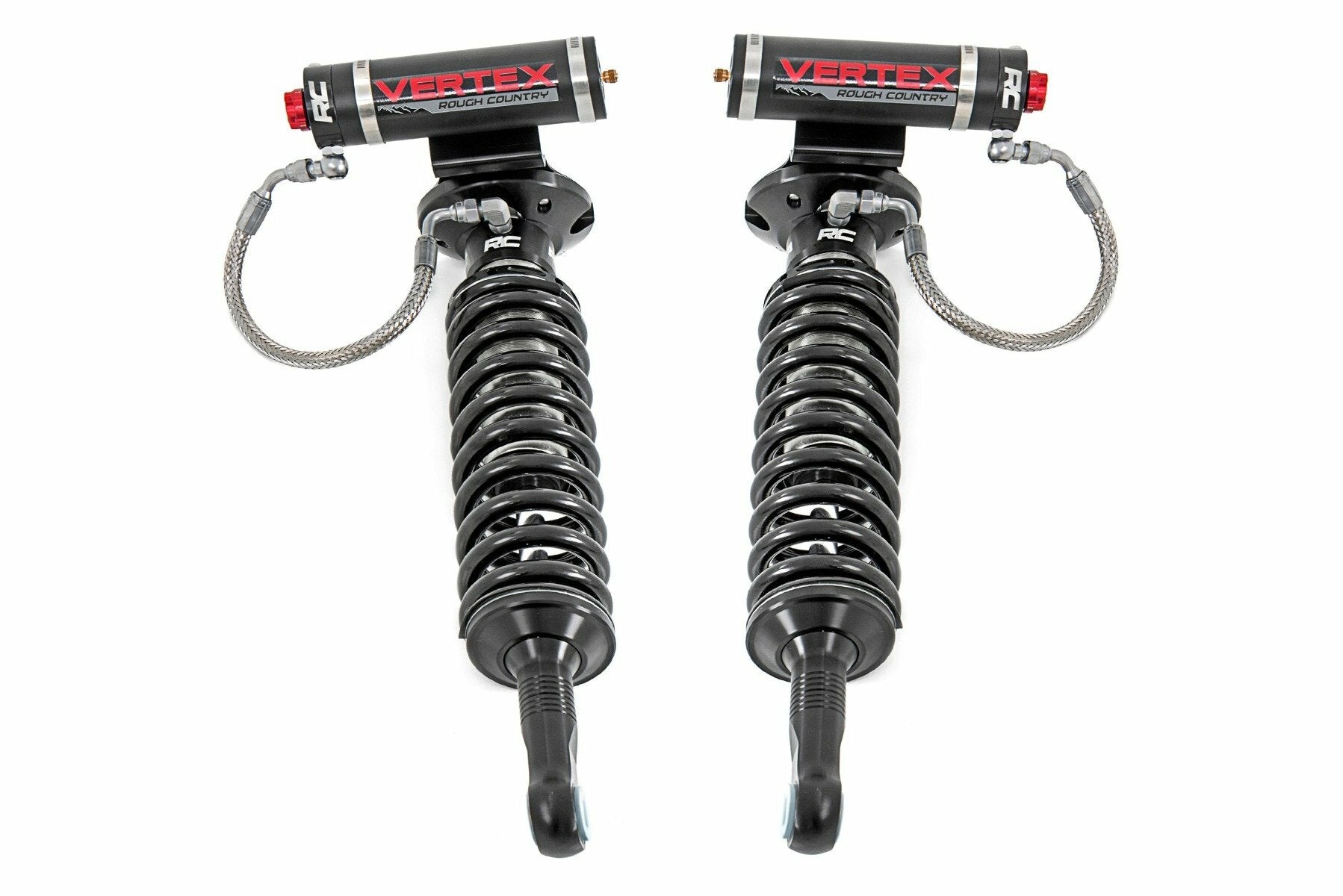 Behold: The pinnacle of off-road performance and smooth ride quality in an affordable package has arrived with Rough Country's 2.5 Vertex 8-Stage Adjustable Reservoir Shocks.These high-performance reservoir shocks offer an elite ride-quality in every situation you face, with an 8-stage adjustable damping system that lets you perfectly dial-in your ride for whatever lies ahead. Whether you want a smooth ride for city streets or the ultimate damping for off-road mayhem, a quick spin of the dial lets you adjust each shock to the exact performance specifications you desire.Rough Country's Nitrogen-charged Vertex Shocks feature a monotube design with an external reservoir for increased oil capacity and damping sensitivity. Each shock features a massive 2.5in diameter piston and a high-flow 22mm chrome hardened piston rod that simply dwarfs the competition. When it comes to investing in a high-end shock, you'll be pleased to find that Rough Country's 2.5in piston design is beefier and offers an impressive 56% greater fluid capacity than the average reservoir shock.A 3-stage, fortified seal system ensures your Vertex shocks keep kicking while the beautifully designed honed steel body offers a long lifespan of reliable performance and killer good looks. This shock is designed to be a true eye-catcher, with a beautiful silver finish, laser-etched RC logo, matching "Vertex" decals, and CNC-machined Billet Aluminum accents. Rear shocks feature a durable bracket system with laser-etched logo and a premium braided steel reservoir line.Includes an Industry-leading 3-year Warranty!