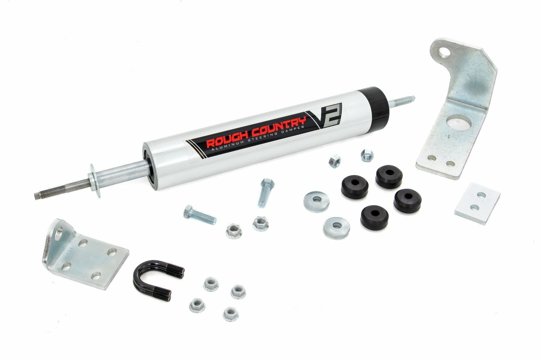 Superior Design and Comfort. Give yourself peace of mind when upgrading to a larger wheel and tire set up with Rough Country's V2 stabilizers! Steering stabilizers are designed to restrain "bump steer" and front-end vibration, giving added life to tires, ball joints, and other steering components. Rough Country's V2 stabilizers improve the overall driving experience by providing precise dampening raising the vehicle's overall comfort and functionality.Durable Construction. Rough Country's V2 stabilizers boast a T6061 brushed aluminum body with black anodized accents giving it a striking visual appearance that also dissipates heat faster than other materials. The internal 46mm high-flow piston offers countless years of durability. Rough Country's V2 stabilizers are the pinnacle of a true performance upgrade.Installation. Rough Country's V2 stabilizers can be installed in no time! This full kit can be installed at home using standard tools and can be completed efficiently and quickly!3-Year Warranty. Rough Country's V2 stabilizers are backed with Rough Country's 3-year replacement warranty towards manufacturer defects. As such, the product is protected from structural and workmanship damage after the date of purchase. With our industry-leading warranty give yourself peace of mind when using Rough Country's Suspension products!