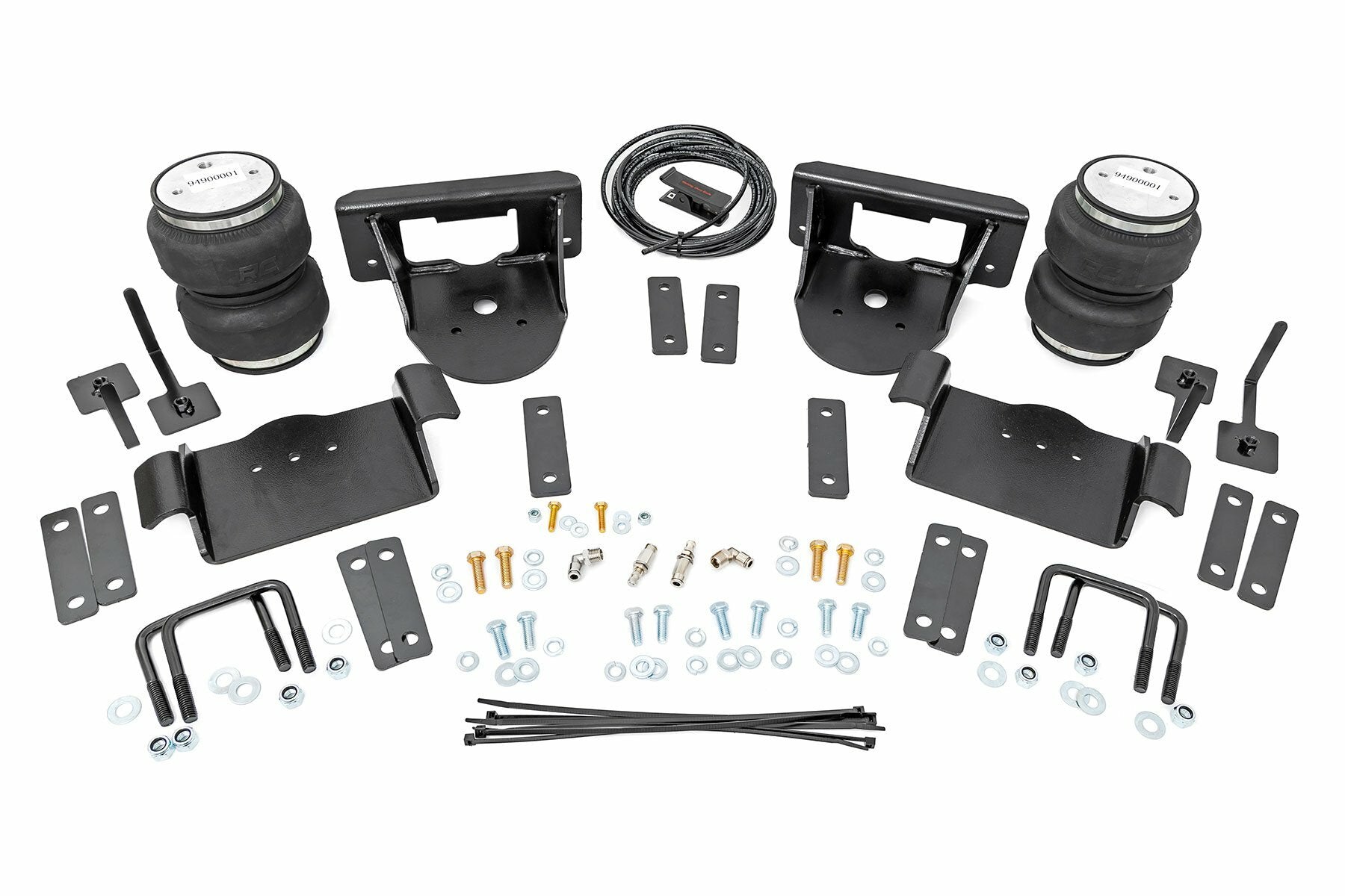Ideal Leveling. Is your truck your workhorse? The main attraction to the pick-up line is the accessibility to haul and tow as desired. However, due to the amount of weight in the bed, or the condition of the vehicle's rear leaf springs, this can cause the vehicle to be un-level when under load. Here at Rough Country, we created an innovative new product to ensure that these are troubles of the past. Introducing, Rough Country's Rear Air Spring Kit.Heavy-duty Construction. Rough Country's Rear Air Spring Kit features two RC branded high-quality double convoluted airbags complemented with DOT-approved airlines. Whether you plan on towing or hauling in the not-so-distant future Rough Country's Air Spring kit is the must-have accessory to ensure that your trailer is level reducing the weight off of the tongue of your trailer. Each kit offers 1/4" push connector fittings and all of the bracketry needed to ensure installation is lightning fast and secure! Rough Country's Air Spring kit provides up to 5,000 lbs of load support to ensure that you experience less sway and bottoming out when braking and steering!Installation. With an estimated timeframe of 1-2 hours this full kit can be installed at home using standard tools and can be completed efficiently and quickly!Limited Lifetime Replacement Warranty. Rough Country's Rear Air Spring Kit is backed with a limited lifetime replacement warranty towards manufacturer defects. As such, the product is protected from structural and workmanship damage after the date of purchase. With our industry-leading warranty give yourself peace of mind when using Rough Country's Suspension products!