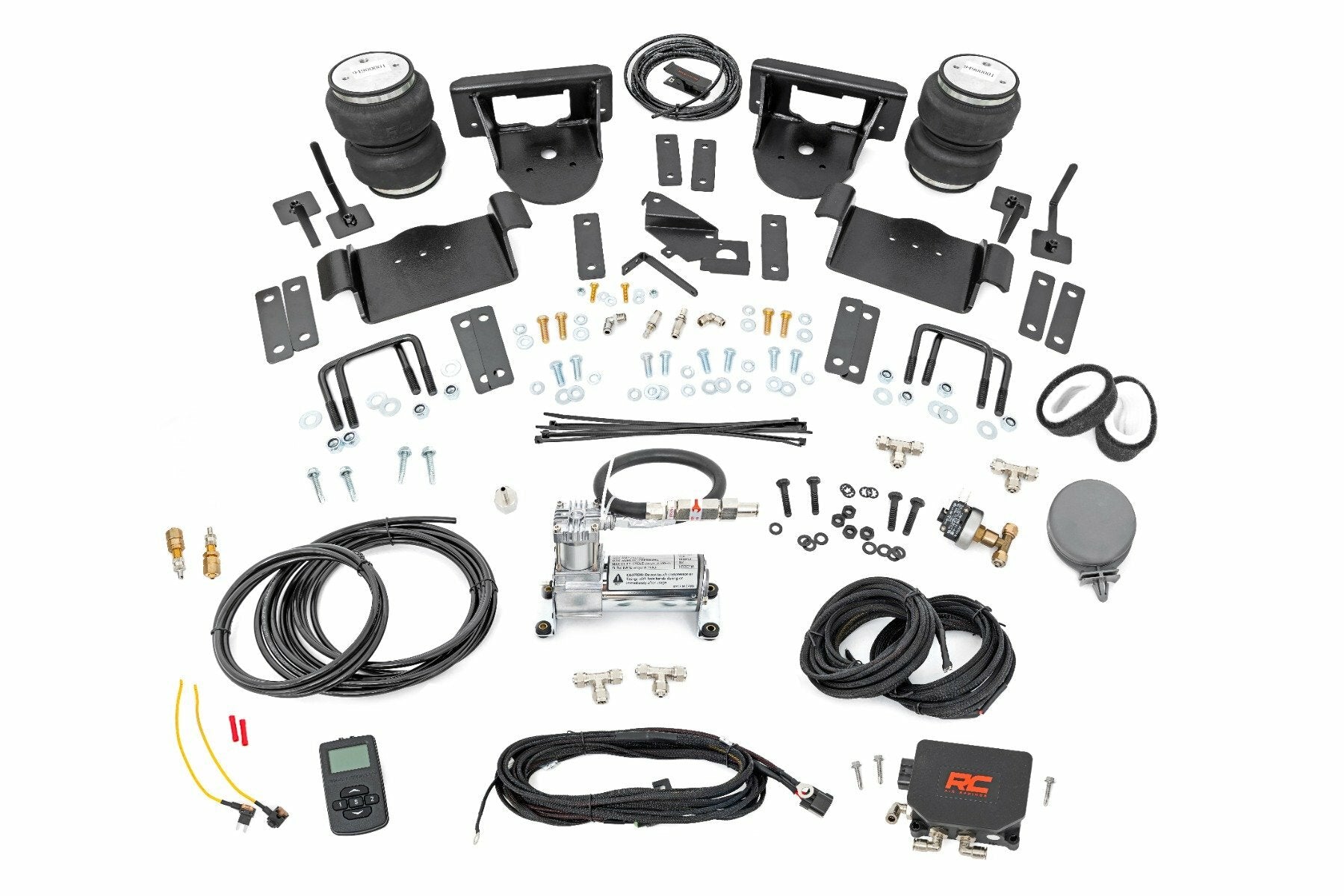 Ideal Leveling. Is your truck your workhorse? The main attraction to the pick-up line is the accessibility to haul and tow as desired. However, due to the amount of weight in the bed, or the condition of the vehicle's rear leaf springs, this can cause the vehicle to be un-level when under load. Here at Rough Country, we created an innovative new product to ensure that these are troubles of the past. Introducing, Rough Country's Rear Air Spring Kit. Heavy-duty Construction. Rough Country's Rear Air Spring Kit features two RC branded high-quality double convoluted airbags complemented with DOT-approved airlines. Whether you plan on towing or hauling in the not-so-distant future Rough Country's Air Spring kit is the must-have accessory to ensure that your trailer is level reducing the weight off of the tongue of your trailer. Each kit offers 1/4" push connector fittings and all of the bracketry needed to ensure installation is lightning fast and secure! Rough Country's Air Spring kit provides up to 5,000 lbs. of load support to ensure that you experience less sway and bottoming out when braking and steering!