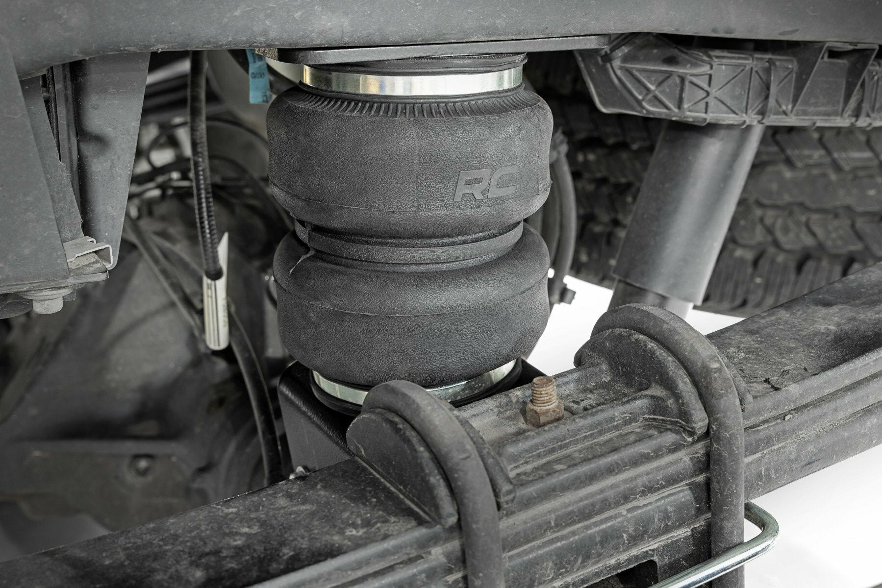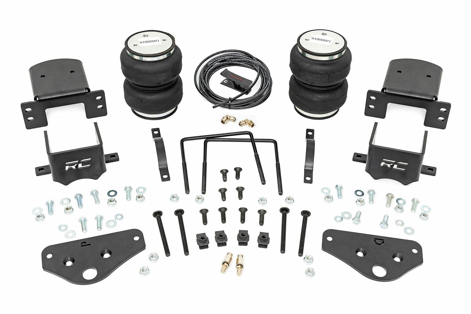 Ideal Leveling. Is your truck your workhorse? The main attraction to the pick-up line is the accessibility to haul and tow as desired. However, due to the amount of weight in the bed, or the condition of the vehicle's rear leaf springs, this can cause the vehicle to be un-level when under load. Here at Rough Country, we created an innovative new product to ensure that these are troubles of the past. Introducing, Rough Country's Rear Air Spring Kit.Heavy-duty Construction. Rough Country's Rear Air Spring Kit features two RC branded high-quality double convoluted airbags complemented with DOT-approved airlines. Whether you plan on towing or hauling in the not-so-distant future Rough Country's Air Spring kit is the must-have accessory to ensure that your trailer is level reducing the weight off of the tongue of your trailer. Each kit offers 1/4" push connector fittings and all of the bracketry needed to ensure installation is lightning fast and secure! Rough Country's Air Spring kit provides up to 5,000 lbs of load support to ensure that you experience less sway and bottoming out when braking and steering!Installation. With an estimated timeframe of 1-2 hours this full kit can be installed at home using standard tools and can be completed efficiently and quickly!Limited Lifetime Replacement Warranty. Rough Country's Rear Air Spring Kit is backed with a limited lifetime replacement warranty towards manufacturer defects. As such, the product is protected from structural and workmanship damage after the date of purchase. With our industry-leading warranty give yourself peace of mind when using Rough Country's Suspension products!