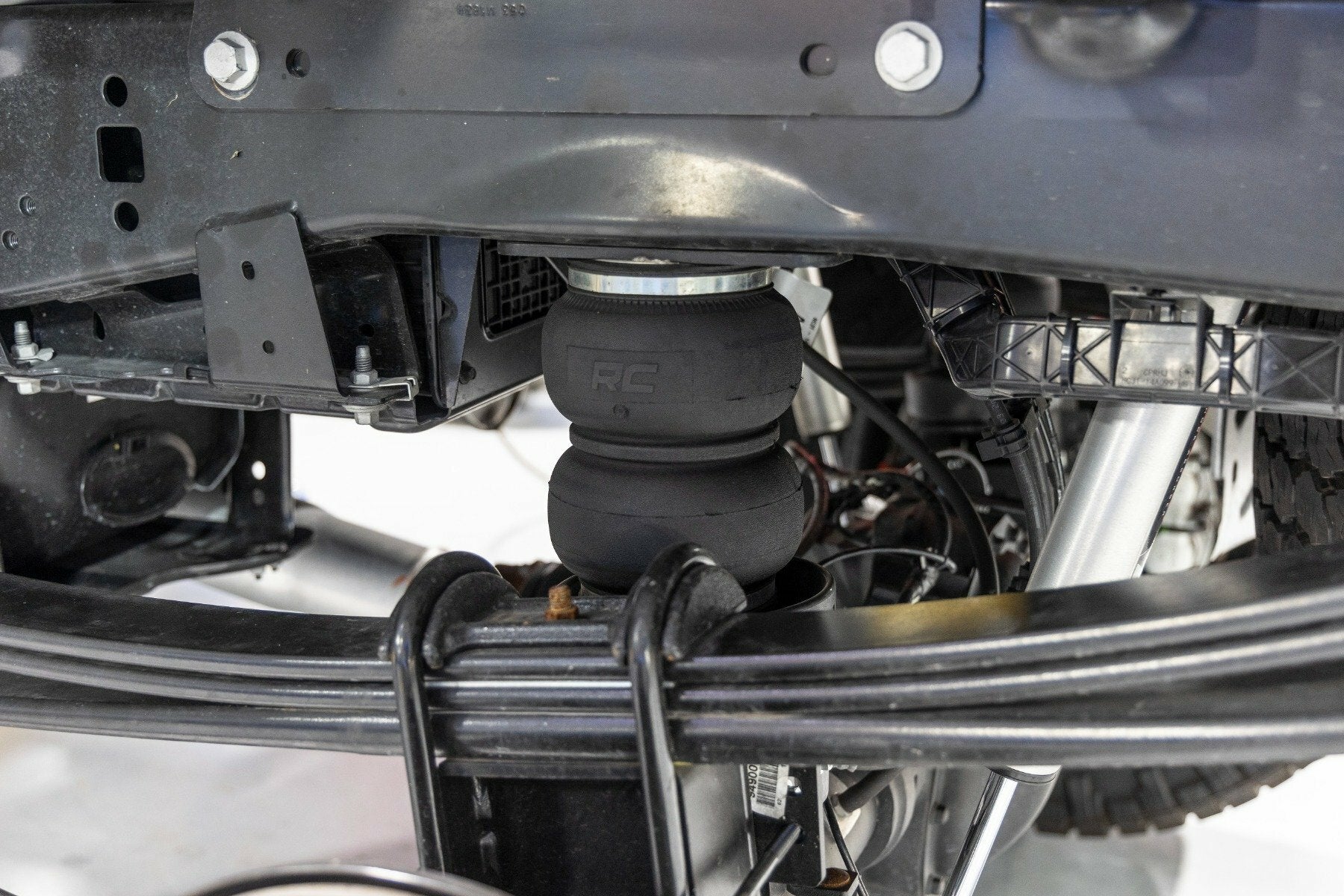 Ideal Leveling. Is your truck your workhorse? The main attraction to the pick-up line is the accessibility to haul and tow as desired. However, due to the amount of weight in the bed, or the condition of the vehicle's rear leaf springs, this can cause the vehicle to be un-level when under load. Here at Rough Country, we created an innovative new product to ensure that these are troubles of the past. Introducing, Rough Country's Rear Air Spring Kit. Heavy-duty Construction. Rough Country's Rear Air Spring Kit features two RC branded high-quality double convoluted airbags complemented with DOT-approved airlines. Whether you plan on towing or hauling in the not-so-distant future Rough Country's Air Spring kit is the must-have accessory to ensure that your trailer is level reducing the weight off of the tongue of your trailer. Each kit offers 1/4" push connector fittings and all of the bracketry needed to ensure installation is lightning fast and secure! Rough Country's Air Spring kit provides up to 5,000 lbs. of load support to ensure that you experience less sway and bottoming out when braking and steering!