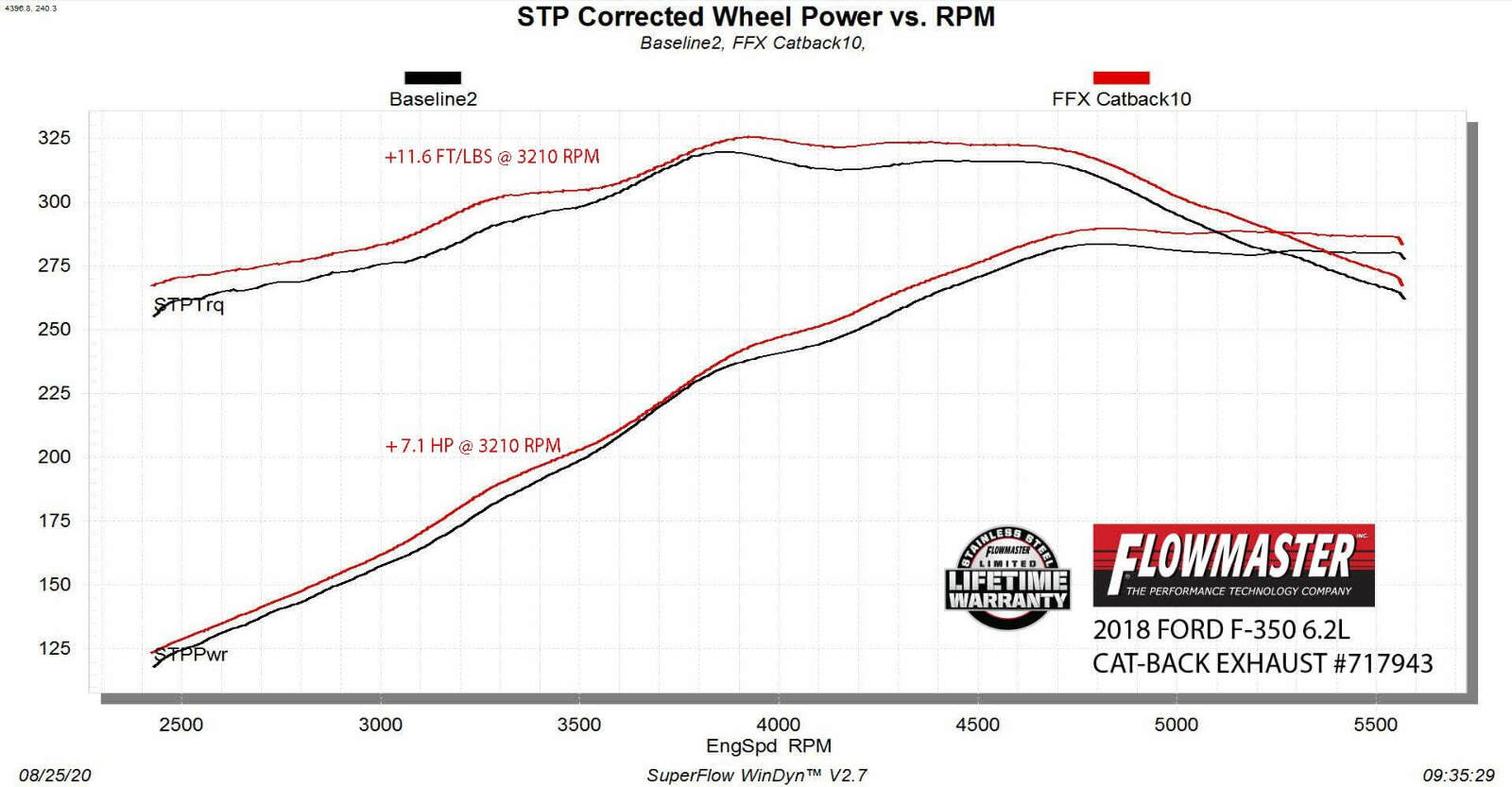 - Max increases of up to 7.1 hp and 11.6 lb-ft over the stock exhaust at the rear wheels
