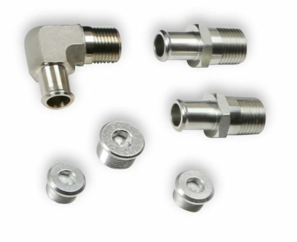 Replacement Plugs and Heater Hose Adapters for Holley Gen III Hemi Mid-Mount Accessory Drive System.