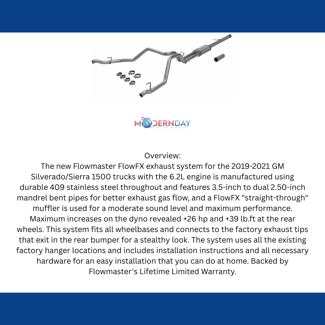 The new Flowmaster FlowFX exhaust system for the 2019-2021 GM Silverado/Sierra 1500 trucks with the 6.2L engine is manufactured using durable 409 stainless steel throughout and features 3.5-inch to dual 2.50-inch mandrel bent pipes for better exhaust gas flow, and a FlowFX "straight-through" muffler is used for a moderate sound level and maximum performance. Maximum increases on the dyno revealed +26 hp and +39 lb.ft at the rear wheels. This system fits all wheelbases and connects to the factory exhaust tips that exit in the rear bumper for a stealthy look. The system uses all the existing factory hanger locations and includes installation instructions and all necessary hardware for an easy installation that you can do at home. Backed by Flowmaster's Lifetime Limited Warranty.