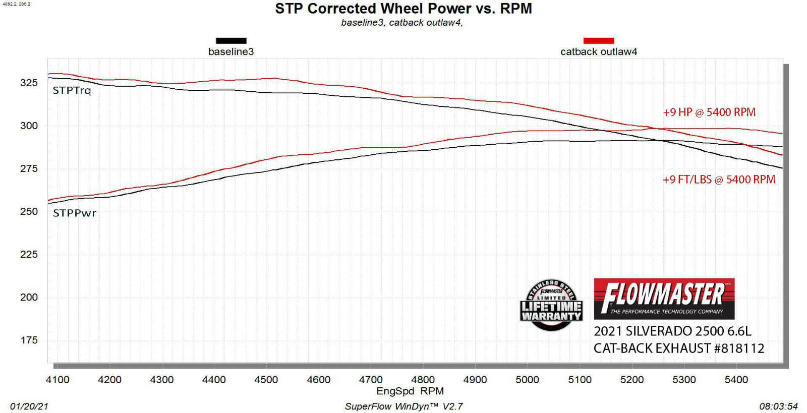 - Max increases of up to 9 hp and 9 lb.ft. over the stock exhaust at the rear wheels