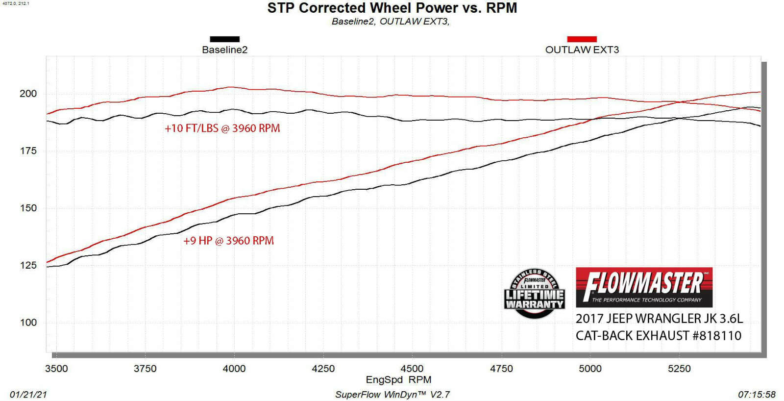 Flowmaster introduces our new Outlaw Extreme stainless steel exhaust system for the 2007-2018 Jeep Wrangler JK with the 3.6L/3.8L engines. This system uses an Outlaw series muffler for a deep powerful sound and increased performance. 3.0-inch mandrel bent 409 stainless steel tubing is used for maximum exhaust flow and durability. The system has a turndown style dump exit right after the muffler to eliminate the over-axle tailpipe. This elimination of the tailpipe helps to improve ground clearance and departure angle when you are driving in more extreme off-road situations. All of the necessary hardware is included and factory mounting locations are used for an easy installation. Backed by Flowmaster's Lifetime Limited Warranty.