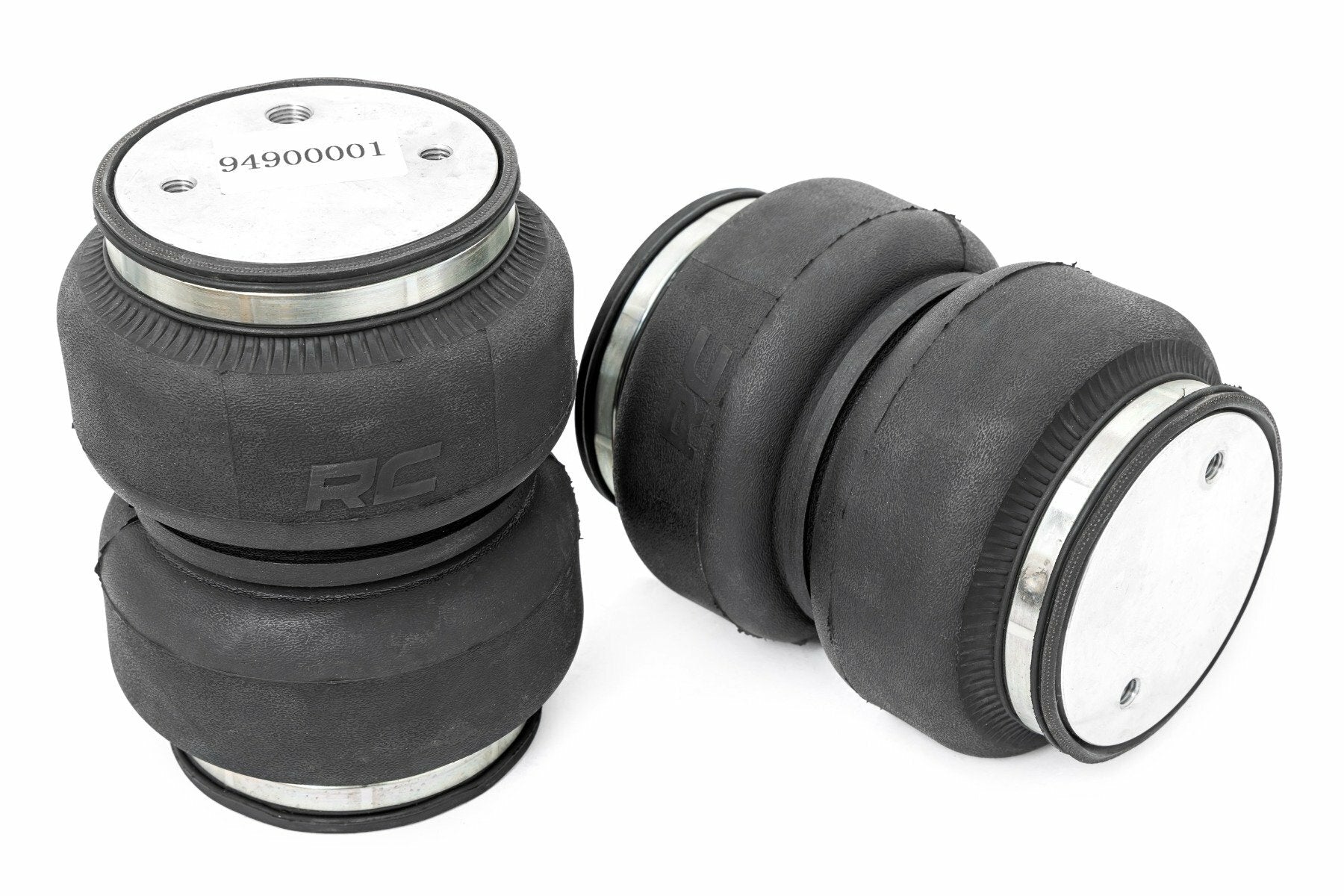 Ideal Leveling. Is your truck your workhorse? The main attraction to the pick-up line is the accessibility to haul and tow as desired. However, due to the amount of weight in the bed, or the condition of the vehicle's rear leaf springs, this can cause the vehicle to be un-level when under load. Here at Rough Country, we created an innovative new product to ensure that these are troubles of the past. Introducing, Rough Country's Rear Air Spring Kit. Heavy-duty Construction. Rough Country's Rear Air Spring Kit features two RC branded high-quality double convoluted airbags complemented with DOT-approved airlines. Whether you plan on towing or hauling in the not-so-distant future Rough Country's Air Spring kit is the must-have accessory to ensure that your trailer is level reducing the weight off of the tongue of your trailer. Each kit offers 1/4" push connector fittings and all of the bracketry needed to ensure installation is lightning fast and secure! Rough Country's Air Spring kit provides up to 5,000 lbs. of load support to ensure that you experience less sway and bottoming out when braking and steering!
