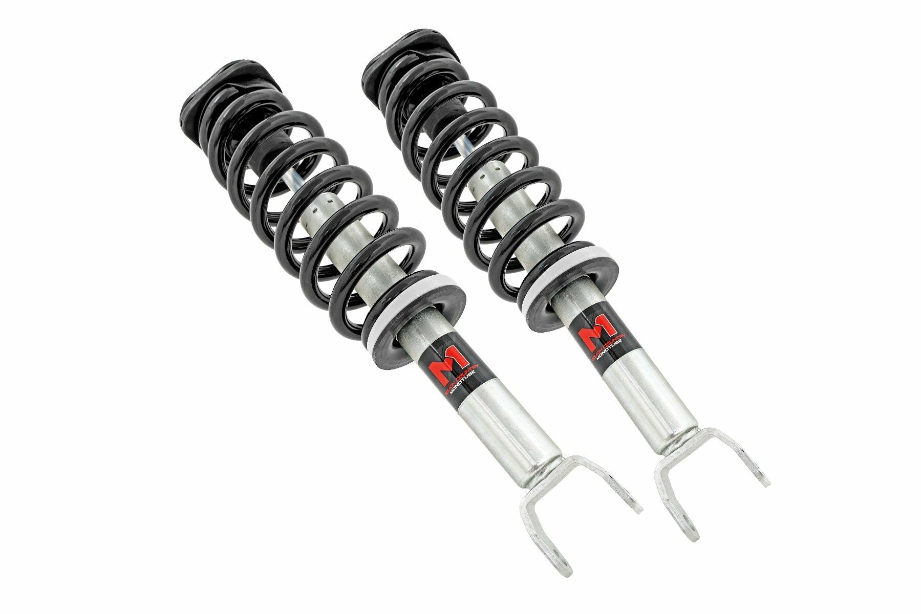 Improved Stance, Balance, and Handling. If you want to improve your vehicle's on-road performance and off-road capabilities, Rough Country's M1 Loaded Strut Kits are the way to go. Our M1 Loaded Struts help stabilize your vehicle's movements, enhancing control when you turn, brake, accelerate or ride over uneven road surfaces. As an adjustable ride height strut, these M1's keep your suspension from overextending, providing a more consistent ride. Made for rugged off-road performance, our M1 monotube struts have a 46mm digressive piston for a more stable ride, preserving the smooth ride quality you need.Quality Construction. Rough Country's M1 Loaded Struts have been engineered to give you the most reliable performance, increased driving comfort, and all-around performance for your vehicle. Made from 2" seamless extruded tubing and feature durable vulcanized natural rubber bushings. They're also zinc plated for resistance against the elements. Plus, they're adjustable in height. Utilizing multiple grooves in the strut body the spring perch can be raised or lowered. So whether you're looking to add a little extra clearance for off-roading or just want your ride to sit a little higher, our M1 Monotube Loaded Struts are the perfect solution.Installation and Warranty. This bolt-on installation requires just basic tools and about 2-3 hours to complete. Our Strut Kit is backed with a limited lifetime replacement warranty towards manufacturer defects. As such, the product is protected from structural and workmanship damage after the date of purchase. With our industry-leading warranty, give yourself peace of mind when using Rough Country's products!