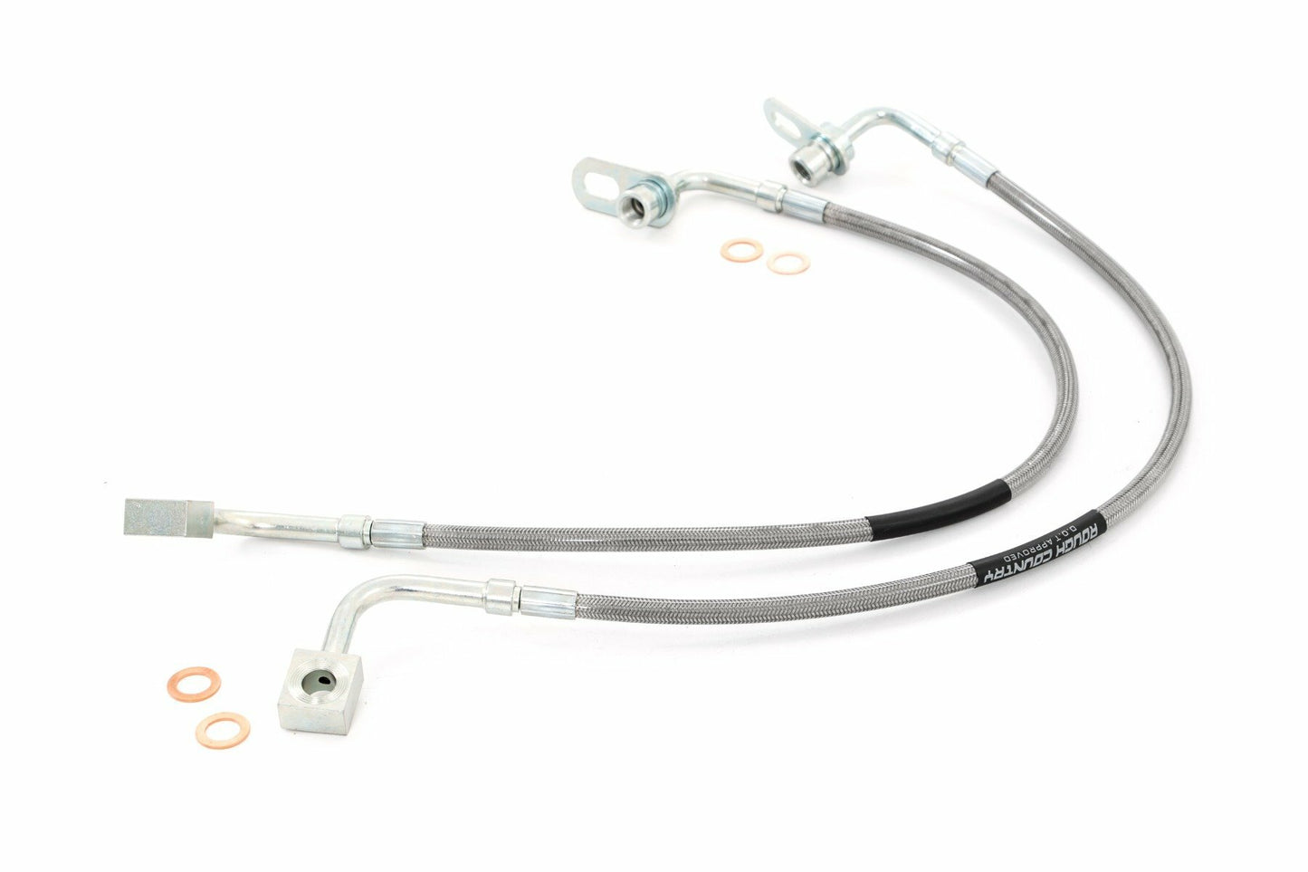 Upgrade your worn-out rubber brake lines with Rough Country's Stainless Extended Steel Brake Line Kit. Our DOT-approved brake line kits offer the necessary extra length to install your application, perfect for vehicles lifted 6in and for anyone who wants to swap out poor-performing or decaying factory brake lines.Rough Country's Stainless Steel replacements offer superior protection and a seriously long lifespan. A braided stainless steel exterior keeps your lines free from off-roaddebris, rocks, and mud that can penetrate factory rubber lines. This durable outer layer also prevents expansion of the internal Teflon layer - even under 4,000PSI - keeping fluid moving to the brake line for a noticeably firmer brake pedal feel. High-quality hollow fasteners at both ends of each brake line provide a leak-free flow path.