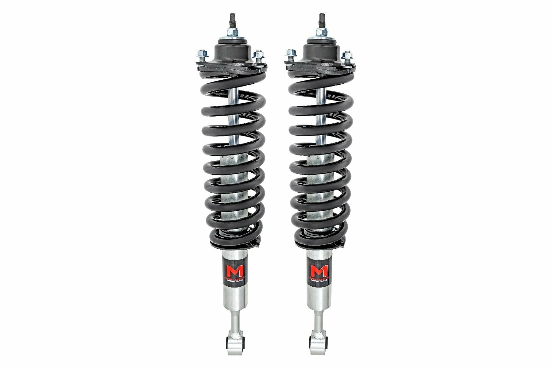 Improved Stance, Balance, and Handling. If you want to improve your vehicle's on-road performance and off-road capabilities, Rough Country's M1 Loaded Strut Kits are the way to go. Our M1 Loaded Struts help stabilize your vehicle's movements, enhancing control when you turn, brake, accelerate or ride over uneven road surfaces. As an adjustable ride height strut, these M1's keep your suspension from overextending, providing a more consistent ride. Made for rugged off-road performance, our M1 monotube struts have a 46mm digressive piston for a more stable ride, preserving the smooth ride quality you need. Quality Construction. Rough Country's M1 Loaded Struts have been engineered to give you the most reliable performance, increased driving comfort, and all-around performance for your vehicle. Made from 2" seamless extruded tubing and feature durable vulcanized natural rubber bushings. They're also zinc plated for resistance against the elements. Plus, they're adjustable in height. Utilizing multiple grooves in the strut body the spring perch can be raised or lowered. So whether you're looking to add a little extra clearance for off-roading or just want your ride to sit a little higher, our M1 Monotube Loaded Struts are the perfect solution. Installation and Warranty. This bolt-on installation requires just basic tools and about 2-3 hours to complete. Our Strut Kit is backed with a limited lifetime replacement warranty towards manufacturer defects. As such, the product is protected from structural and workmanship damage after the date of purchase. With our industry-leading warranty, give yourself peace of mind when using Rough Country's products!