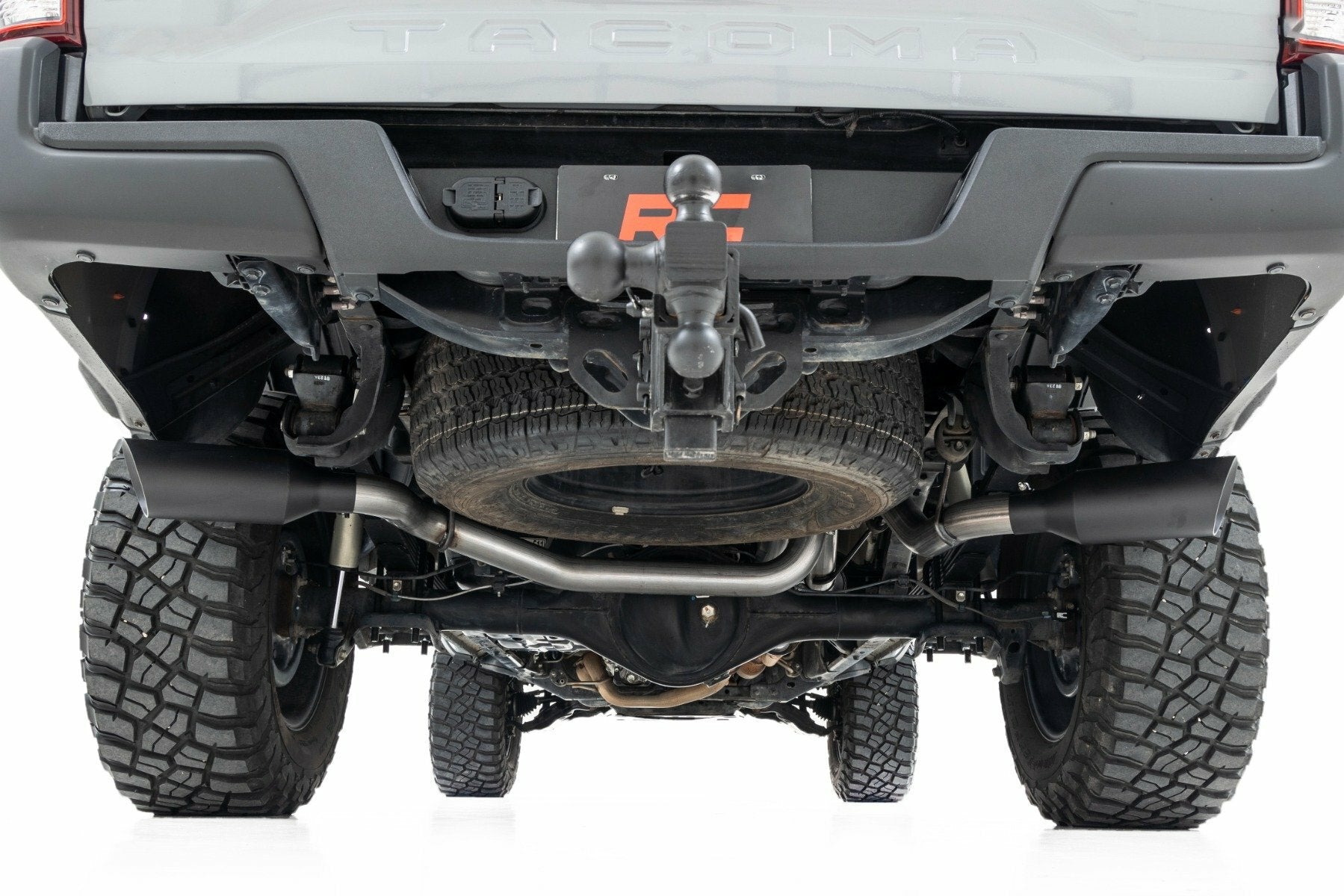 Give your truck an aggressive, throaty growl and killer good looks with Rough Country's Dual Cat-Back Exhaust System for Toyota Tacomamodels. These durable exhaust systems are fine-tuned to improve airflow and deliver the perfect aftermarket exhaust note that will put a smile on your face every time you hit the gas.Each kit features a set of high-temp resistant, dual-wall 304 black stainless tips with RC logo for an improved, aggressive look. Upgrading your exhaust note has never been easier! Each kit conveniently installs onto the factory hangers and features stainless clamps for easy assembly with no welding required!Transform your truck today and let your engine ROAR with the best Toyota Tundra exhaust kit money can buy!
