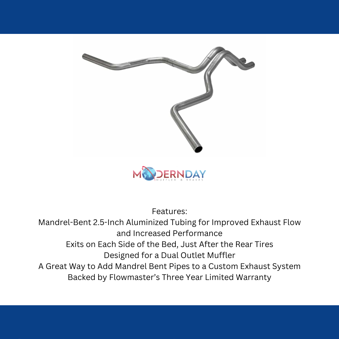 These Flowmaster pre-bent tailpipes fit the popular 1987 to 1996 Ford F-150 trucks. The tailpipes are 2.5-inch, 16-gauge aluminized steel and mandrel bent to allow better flow of the exhaust pulses as they exit the system. These tailpipes are designed to work with dual outlet mufflers and exit on each side of the bed, just after the rear tires. These tailpipes are a great way to add a factory like fitment tailpipe to a custom exhaust. Backed by Flowmaster's three year limited warranty.