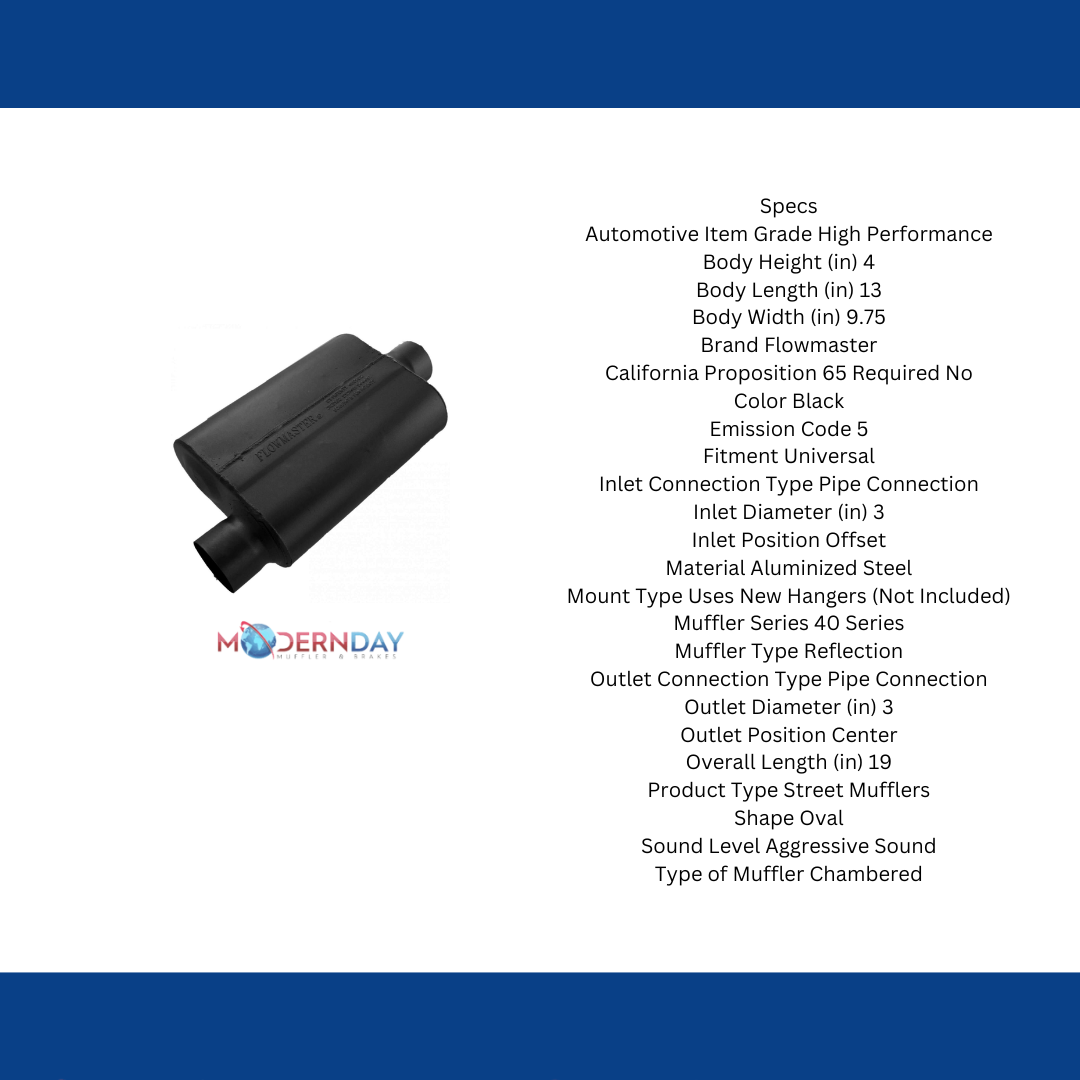 The Original 40 series muffler delivers an aggressive exterior and interior tone. If you're looking for that original Flowmaster sound this is the muffler is for you. Constructed of 16 gauge aluminized steel and fully MIG welded for maximum durability.